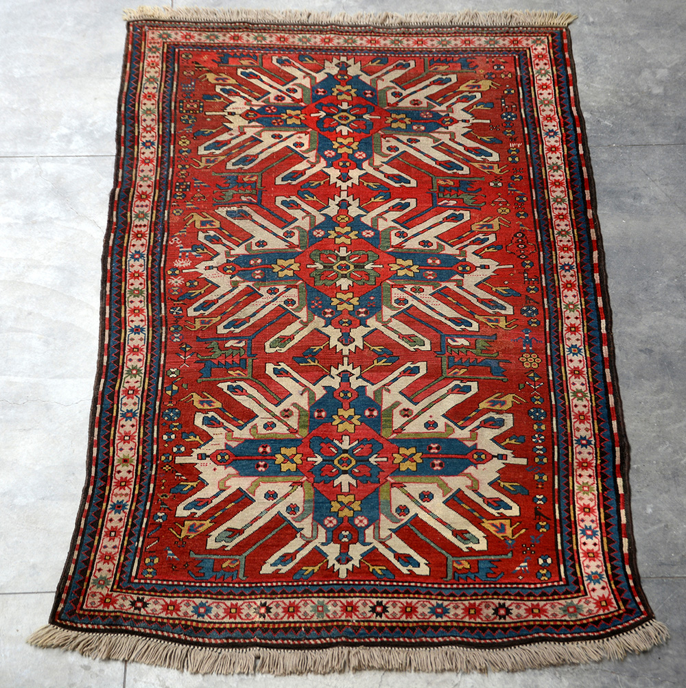Tappeto Karabag, Caucaso inizio secolo XX. Decoro del tipo Hedler Kazak con tre medaglioni nei toni dell'azzurro, rosa, bianco, giallo e verde su fondo rosso (cm 252x160)(difetti e restauri)