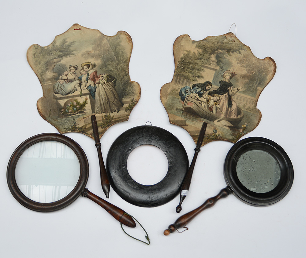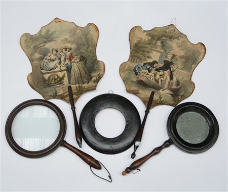 Lotto composto da due ventagli decorati a scene di vita, uno specchio a mano, una cornice tonda ed una grande lente. Secolo XIX (difetti)