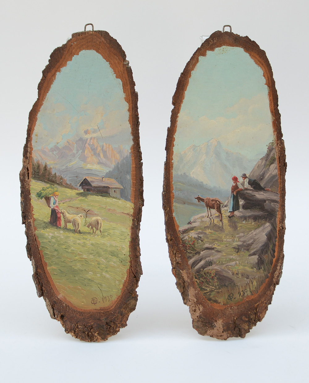 Coppia di curiosi dipinti ad olio su parte di ramo d'albero, raffiguranti paesaggi montani siglati C.P. e datati 1930 (cm 37x15)