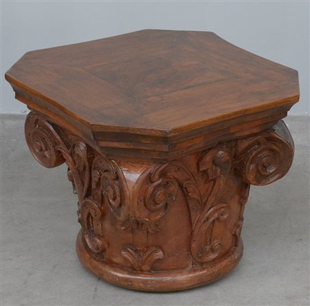 Capitello in legno intagliato a motivi fogliati e riccioli (cm 40x50x40) (difetti)