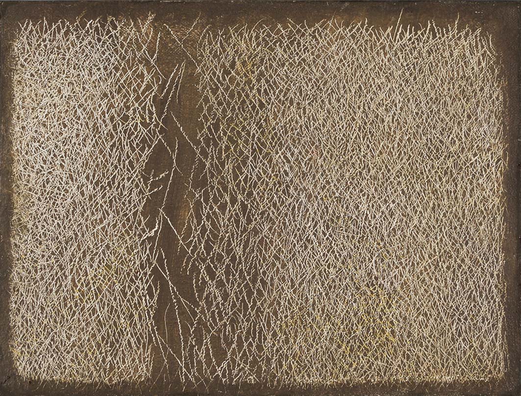 MARIO DELUIGI Treviso 1901 - Venezia 1978 senza titolo (anni '70) grattage marron-sabbia su tela, 34x45 firma al retro autentica della dott.ssa Caterina Deluigi su foto