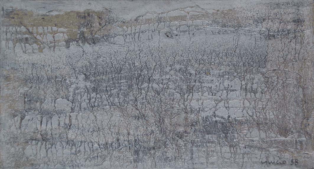 VINICIO VIANELLO Venezia 1923 - 1999 senza titolo 1958 tecnica mista su tela, 35x65 firma e data in basso a destra e al retro autentica di Luca Massimo Barbero su foto esposizioni Galleria l'Elefante Treviso - etichetta e timbro al retro