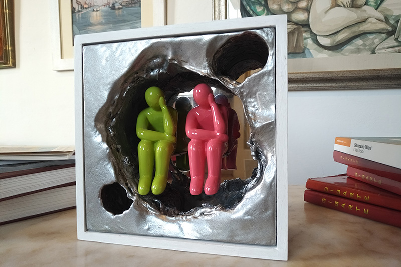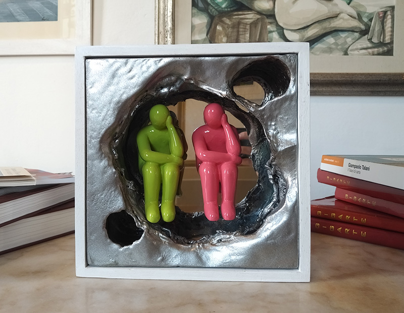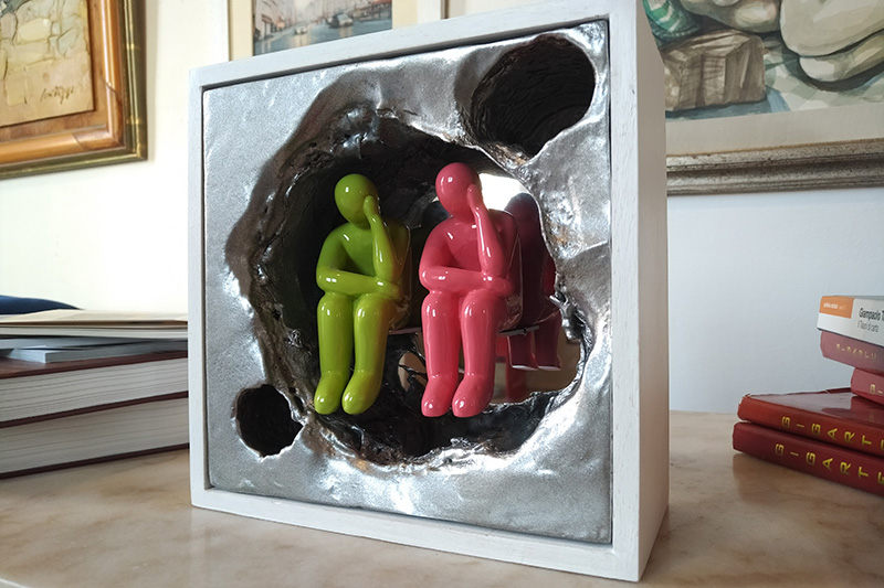 Maurizio Balducci, EPS lavorato a fiamma e colorato in acrilico plexiglass a specchio figure in resina colorate . Dimensioni: 22cm x22cm. Certificazione: Certificato di autenticità n 00007/MB