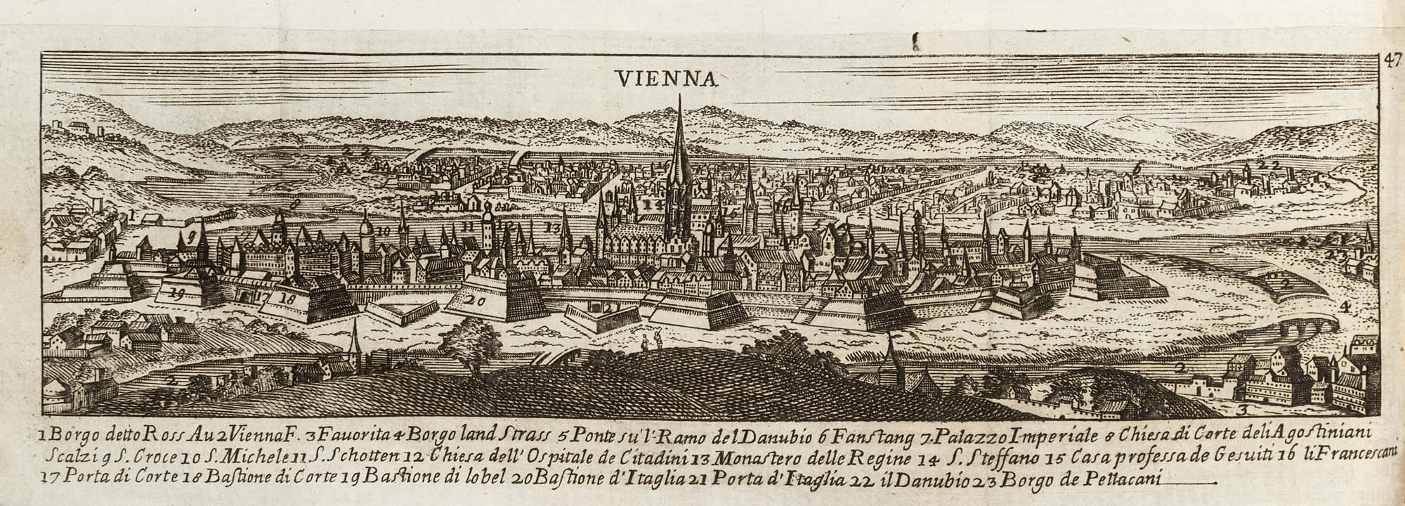 BIRKEN, Sigmund von (1626-1681) - L'origine del Danubio, con li nomi antichi, e moderni di tutti li Fiumi, & Acque, che in esso concorrono. Milano: Marc'Antonio Pandolfo Malatesta, 1685. 12mo (149 x 85mm). Occhiello, 44 tavole incise in rame e ripiegate fra cui la tavola con il corso del Danubio "Origine del Danubio" (su SBN segnate 42 tavole; tavola a p. 63 staccata, alcune occasionali macchie e fioriture). Pelle coeva decorata in oro al dorso, tagli a spruzzo rossi (dorso con difetti e piccole mancanze).-ENBIRKEN, Sigmund von (1626-1681) - L'origine del Danubio, con li nomi antichi, e moderni di tutti li Fiumi, & Acque, che in esso concorrono. Milano: Marc'Antonio Pandolfo Malatesta, 1685. 12mo (149 x 85mm). Half-title, 44 engraved folding plates including the one on the origins of the Danube (SBN calls for 42 plates; plate at p. 63 loose, some occasional spots). Contemporary calf, spine gilt, red marbled edges (some wear and chipping to spine).