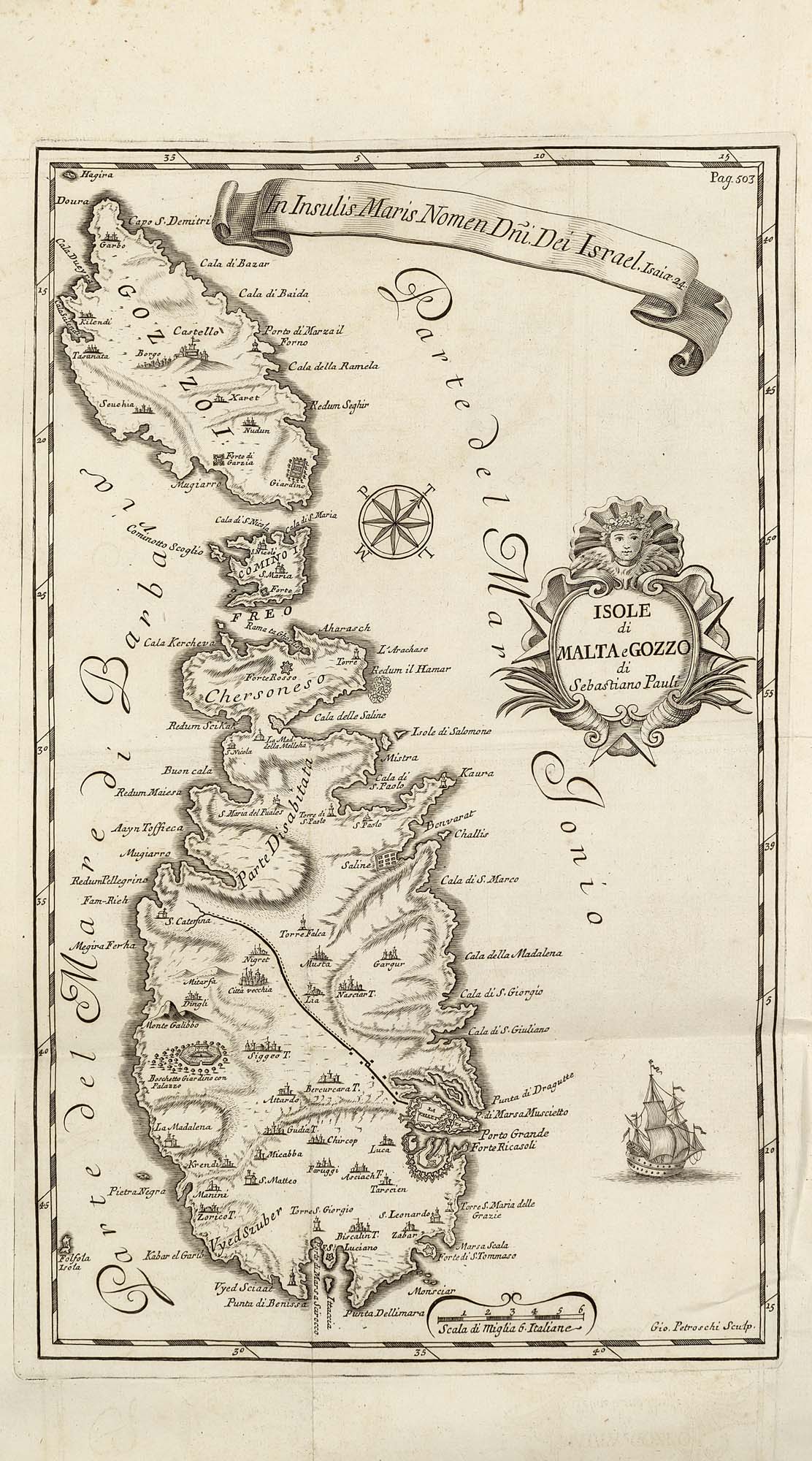 [MALTA] - PAOLI, Sebastiano - Codice Diplomatico Del Sacro Militare Ordine Gerosolimitano Oggi Di Malta. Lucca: Marescandoli, 1733-37. Buona copia di questo importante codice diplomatico di Malta.2 volumi, folio (420 x 265mm). Occhielli, titolo in rosso e nero con vignetta incisa in rame al frontespizio, una tavola generale de' Re di Gerusalemme ripiegata, 3 carte geografiche incise in rame raffiguranti il Regno di Gerusalemme, Rodi e le isole di Malta e Gozzo e 13 tavole a piena pagina incise in rame, alcune incisioni nel testo sia in rame che in legno, alcune scritte stampate in rosso (alcune macchie di umidità e polvere, fioriture e lievi bruniture, senza la tavola sinottica ripiegata che si trova talvolta in alcune copie). Cartone coevo (alcune macchie e fioriture).-EN[MALTA] - PAOLI, Sebastiano - Codice Diplomatico Del Sacro Militare Ordine Gerosolimitano Oggi Di Malta. Lucca: Marescandoli, 1733-37. - A good copy of this important diplomatic codex of Malta.2 volumes, folio (420 x 265mm). Half-titles, titles in red and black with engraved vignette, a general folding table of the Kings of Jerusalem, 3 engraved folding plates of the Kingdom of Jerusalem, Rhodes and the islands of Malta and Gozzo and 13 engraved plates, some engravings and woodcuts in text (occasional browning on text and plates - but the maps in good conditions - without the synoptic folding table sometimes found in other copies). Contemporary boards (some staining and foxing).