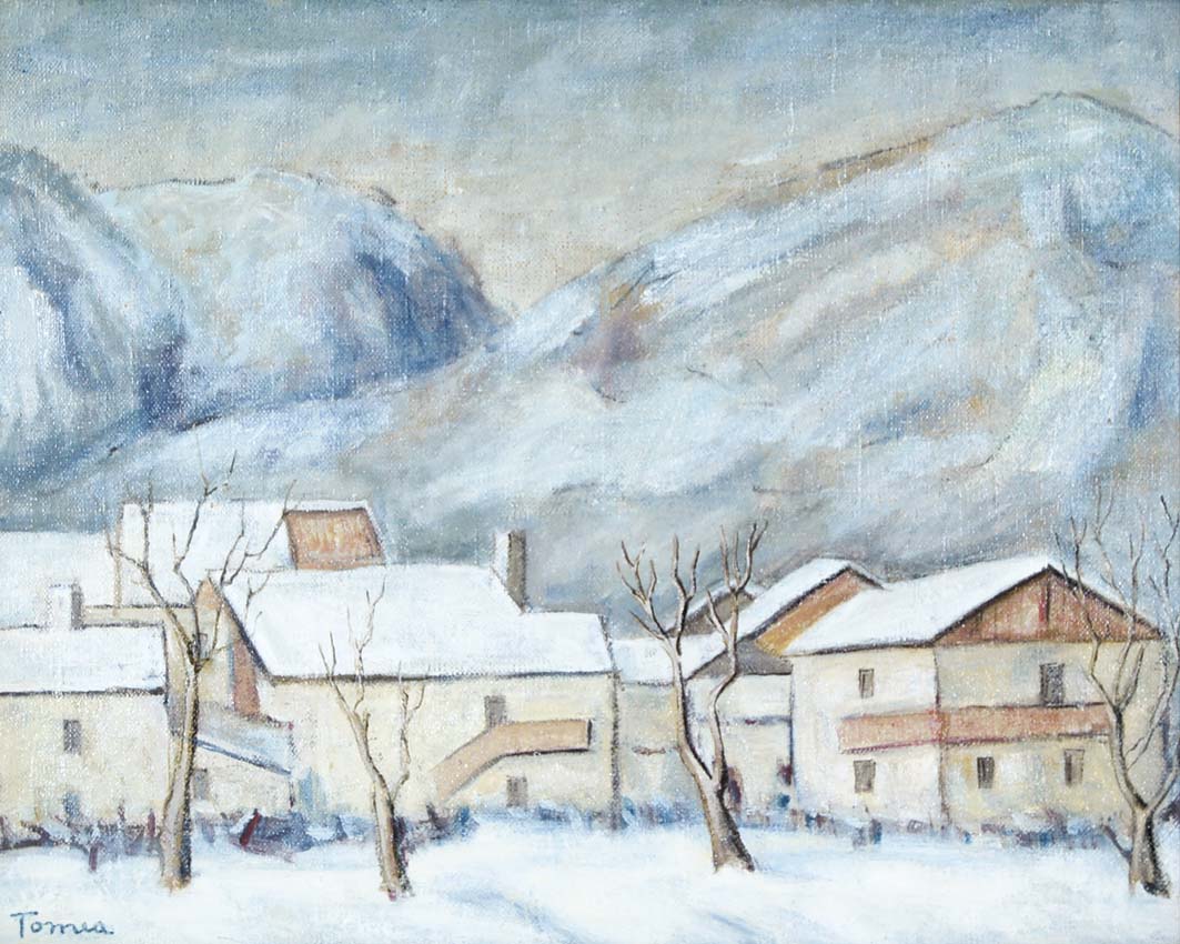 FIORENZO TOMEA Zoppe' di Cadore 1910 - Milano 1960 Nevicata olio su tela, 40x50 firma in basso a sinistra autentica della moglie Camilla Tomea su foto esposizioni Galleria d'Arte Charta Bergamo - etichetta e timbro al retro