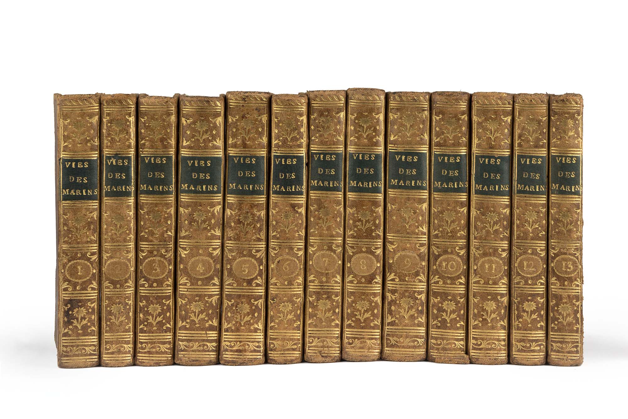 [MARINA] - RICHER, Adrien (1720-1798) - Vies des plus célebres marins. Pargi: Belin, 1789. Buona copia in elegante legatura omogenea di questa interessante serie di vite di comandanti navali: Barbarossa, Cornelis Tromp, Paulin Baron de la Garde, Andrea Doria, Forbin, Le Grand Duquesne, Jean & Victor Marie d'Estrées, Jean Bart, Michiel de Ruyter and Maréchal De Tourville. Tutte le biografie sono accompagnate da un elegante ritratto in antiporta.11 vite in 13 volumi, 12mo (127 x 80mm). Occhielli, ritratti in antiporta ad ogni vita, vignetta xilografica ai frontespizi (occasionali lievi fioriture). Pieno vitello coevo con decori in oro al dorso e titolo su tassello (lievi difetti e piccole perdite ad alcune delle legature). (13)-EN[MARINA] - RICHER, Adrien (1720-1798) - Vies des plus célebres marins. Pargi: Belin, 1789. A fine copy in uniform binding of this interesting life of naval commanders: Barbarossa, Cornelis Tromp, Paulin Baron de la Garde, Andrea Doria, Forbin, Le Grand Duquesne, Jean & Victor Marie d'Estrées, Jean Bart, Michiel de Ruyter and Maréchal De Tourville. Each life with an engraved portrait of the commander.11 lives in 13 volumes, 12mo (127 x 80mm). Half-title, engraved portrait for each life, woodcut device on titles (some occasional light spotting). Contemporary calf, gilt spine, tilte on label (some light rubbing and few occasional chips). (13)
