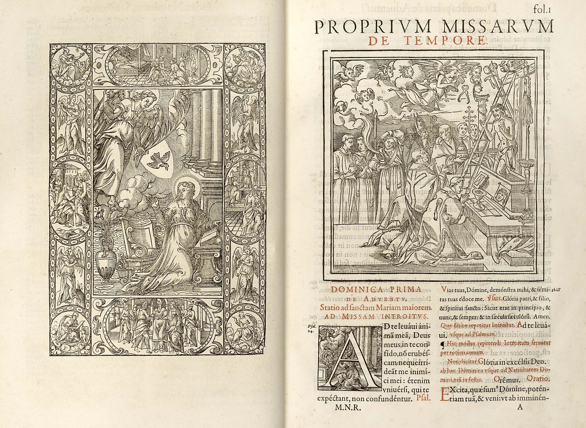 MISSALE ROMANUM - ex decreto sacrosancti Concilii Tridentini restitutum. Pii V pontificis maximi jussu editum. Parigi: Jacques Kerver, 1578.Folio (326 x 237mm). Stampato in rosso e nero, marca tipografica a inizio e in fine, iniziali xilografiche e alcune grandi xilografie nel testo, una a piena pagina, note musicali (alcune lievi macchie di umidità e polvere, più marcate a inizio e fine). Legatura coeva di L. Guetant in pelle finemente decorata in oro (lievi graffi). Provenienza: A. Brolemann (ex libris).-ENMISSALE ROMANUM - ex decreto sacrosancti Concilii Tridentini restitutum. Pii V pontificis maximi jussu editum. Paris: Jacques Kerver, 1578.Folio (326 x 237mm). Printed in red and black, printer's device at beginning and end, woodcut initials and large wooducts of which one full page, musical scores (some light waterstaining and soiling). Contemporary calf by L. Guetant finely decorated in gilt (very lightly rubbed at extremities).