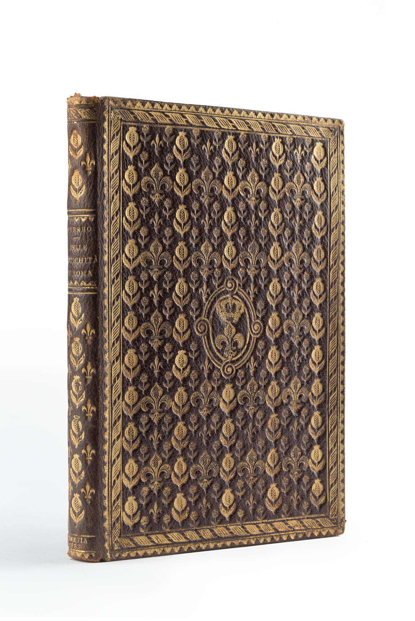 PIRRO, Ligorio (1513-1583) - Libro di M. Pyrrho Ligori [Ligorio] Napoletano delle antichità di roma. Venezia: Tramezino, 1553.Ottima copia in bella legatura in marocchino scuro firmata da Glinger decorata con gigli di Francia, splendide sguardie decorate del XVIII secolo.8vo (141 x 103mm). Grande marca xilografica al frontespizio e a c. G3v, iniziali xilografiche, con carte bianche (lievi tracce di polvere al frontespizio, alcune occasionali fioriture). Marocchino scuro riccamente decorato in oro firmato da Glinger (pochi e lievi graffi).-ENPIRRO, Ligorio (1513-1583) - Libro di M. Pyrrho Ligori [Ligorio] Napoletano delle antichità di roma. Venice: Tramezino, 1553.A fine copy in elegant dark morocco by Glinger decorated in gilt with french lilys and beautiful 18th-century decorative endpapers.8vo (141 x 103mm). Large printer's device on title and on G3v, woodcut initials, with blanks (title lightly soiled, occasional light spotting). Richly decorated dark morocco by Glinger (just a touch rubbed).
