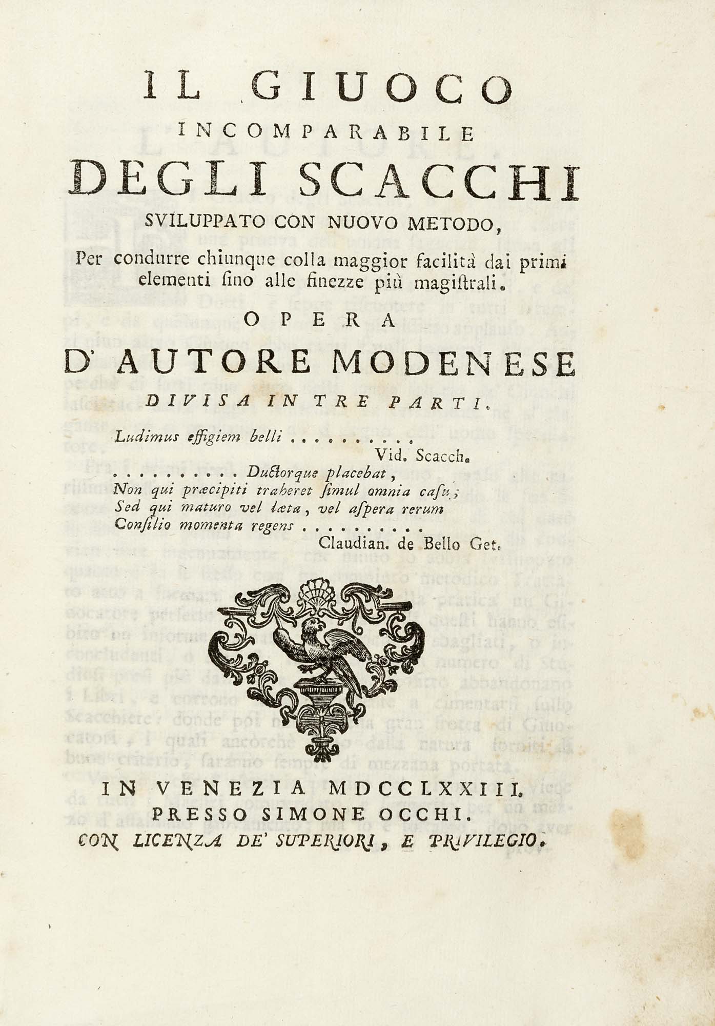 PONZIANI, Domenico Lorenzo (1719-1796) - Il Giuoco Incomparabile de gli Scacchi