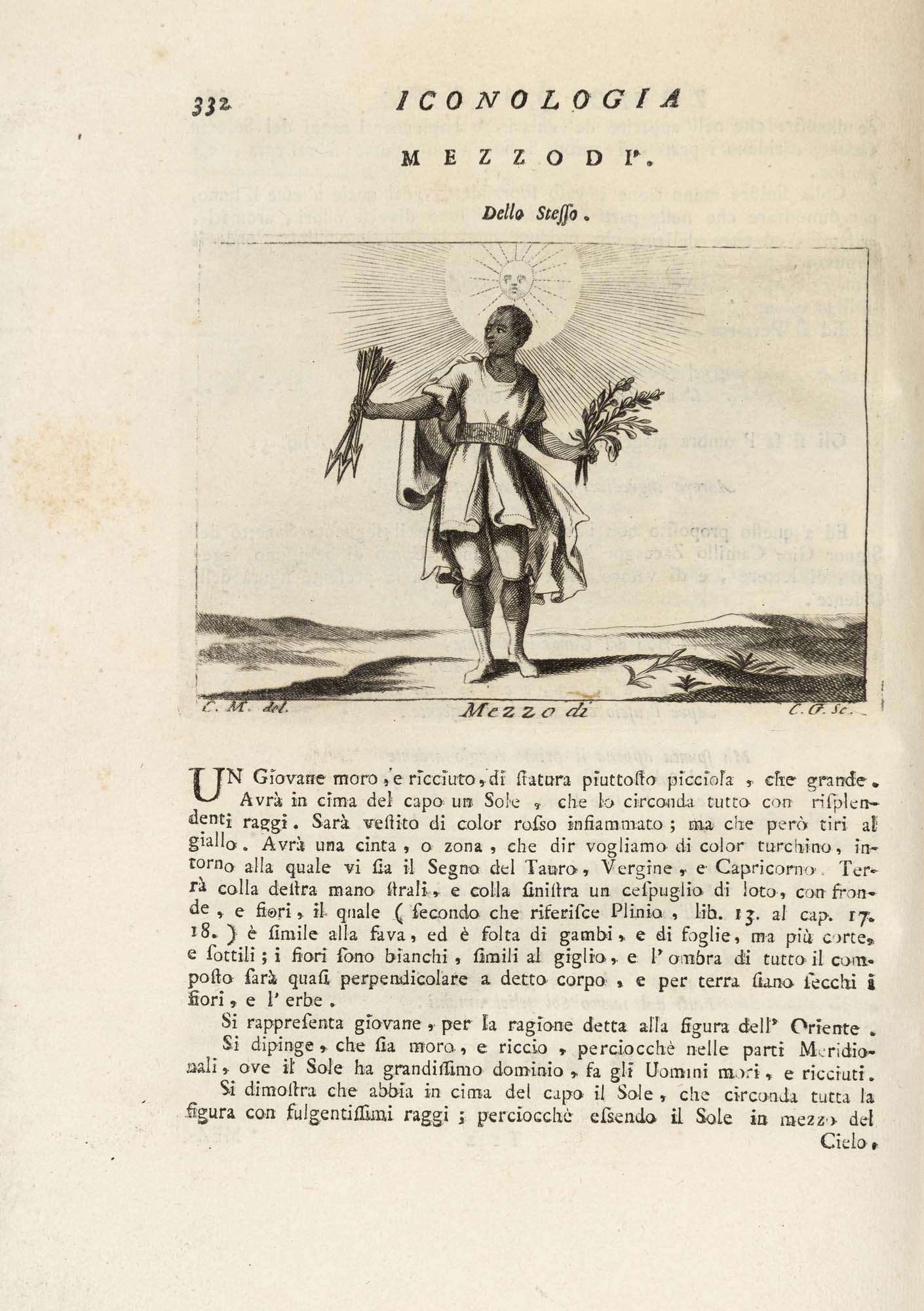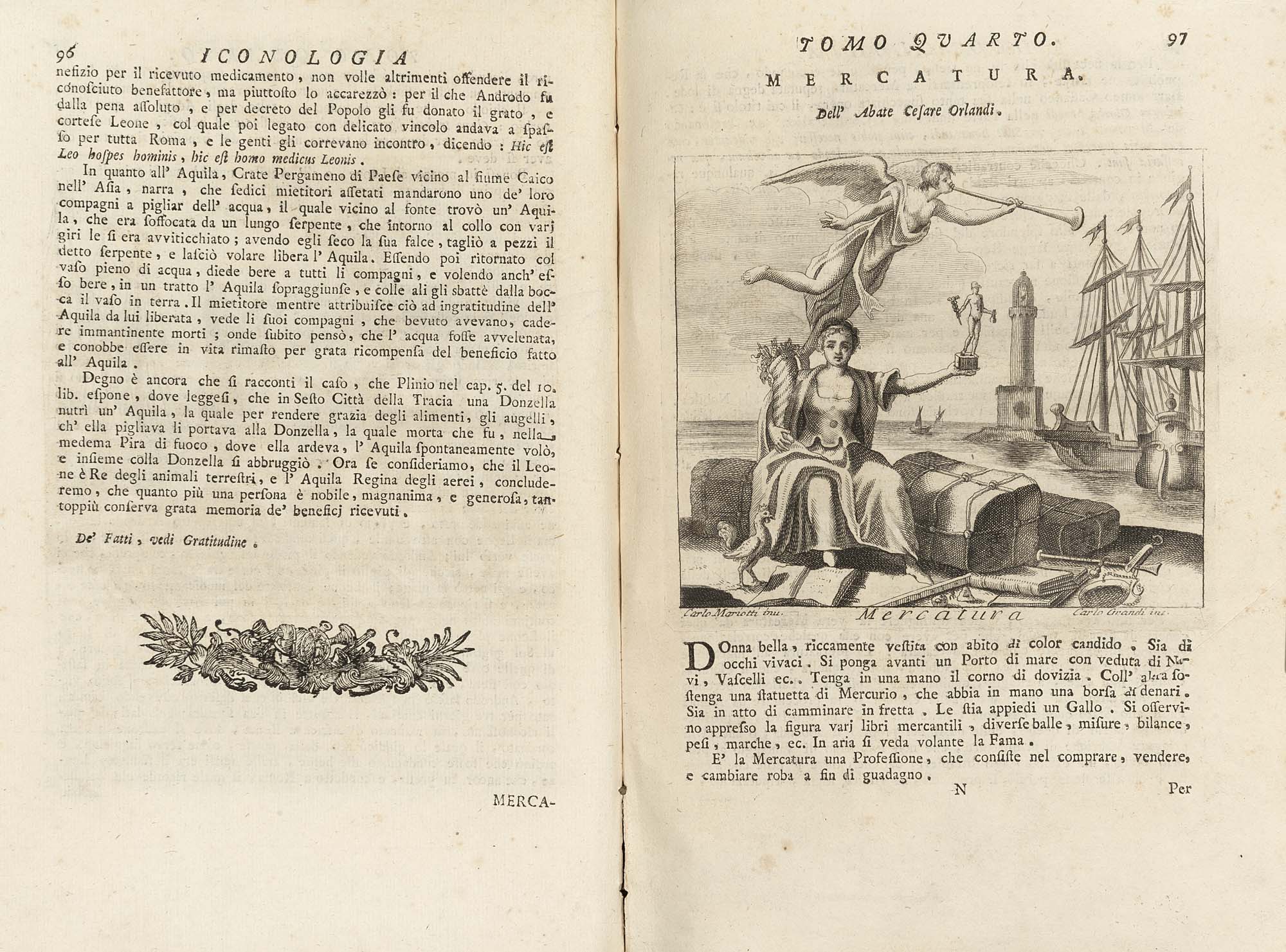 RIPA, Cesare (1560?-1622) - Iconologia del cavaliere Cesare Ripa perugino. Perugia: Piergiovanni Costantini, 1764-67.Edizione riccamente illustrata dell'Iconologia di Cesare Ripa, senza dubbio il repertorio piu vasto e completo di immagini allegoriche e di personificazioni di concetti astratti mai prodotto in Europa, cui attinsero generazioni di artisti e studiosi. Del 1593 fu la prima edizione non illustrata.5 volumi, 4to (261 x 182mm). Frontespizi con vignette allegoriche incise in rame, ritratti dell'abate Cesare Orlandi e di Ripa nel primo tomo, numerosissime vignette calcografiche incise da Sforza Perini, testate e capilettera incisi in rame da Carloni, Grandi, Mariotti etc. finalini xilografici (alcune lievi bruniture e fioriture, vol. V con piccolo strappo marginale senza perdite al frontespizio e un piccolo foro di tarlo alla fine). Pergamena coeva, dorso decorato in oro, i primi 4 volumi uniformi con tagli blu e il quinto in legatura simile con alcune carte non ancora aperte (alcune macchie). (5)-ENRIPA, Cesare (1560?-1622) - Iconologia del cavaliere Cesare Ripa perugino. Perugia: Piergiovanni Costantini, 1764-67.A richly illustrated edition of Ripa's iconology, the best repertoir of allegorical images and personifications of abstract concepts. The first edition was printed without illustrations in 1593.5 volumes, 4to (261 x 182mm). Titles with engraved allegorical vignettes, portrait of the abbot Cesare Ripa and Cesare Orlandi, numerous engraved vignettes by Sforza Perini, engraved head-pieces and initials, woodcut endpieces (some light browning and spotting, vol. V with small marginal tear to bottom corner of title and small marginal wormhole at end). Contemporary vellum, gilt spine, the first 4 volumes uniformly bound with blue edges, vol. V in similar binding with some unopened leaves (some light staining). (5)