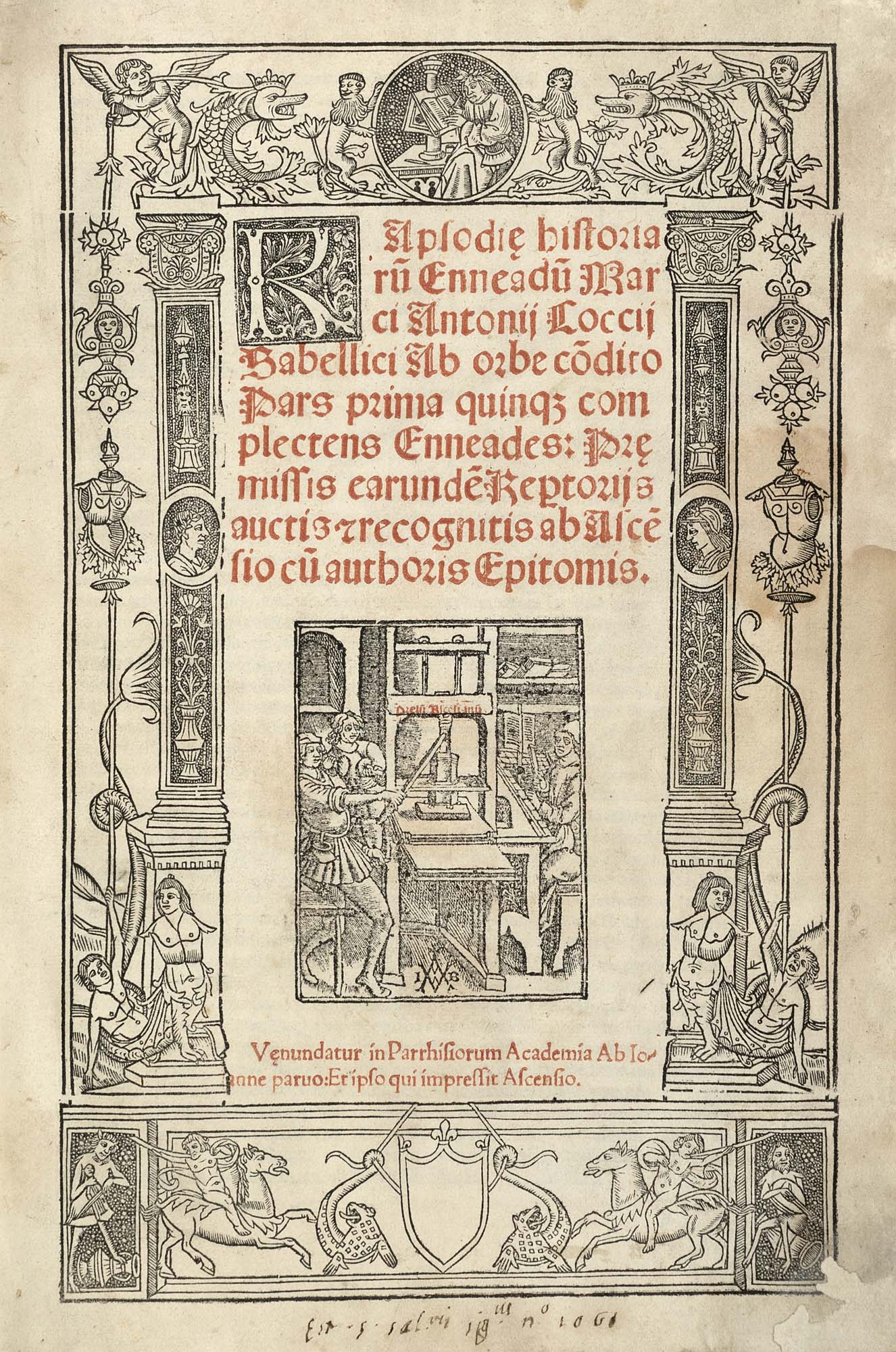 SABELLICO, Marco Antonio Coccio (1436-1506) - Rapsodiae historiarum Enneadu. Parigi: Josse Bade, 1516-17.La storia moderna di Sabellico fu pubblicata per la prima volta nel 1498 e grazie al grande successo commerciale venne più volte ristampata negli anni successivi. Nell'edizione del 1504, l'ultima edita dall'autore, viene menzionata per la prima volta la scoperta dell'America. Josse Bade ristampò 4 volte l'opera tra il 1509 e il 1528.2 parti in un 2 volumi, folio (293 x 205mm). Frontespizi in rosso e nero entro grande bordure xilografiche e con vignette al centro, iniziali xilografiche, con ultima bianca (alcune piccole riparazioni marginali, più marcate all'inizio del secondo volume a coprire una macchia di umidità al margine esterno che continua alle carte successive). Cartone coevo (alcune macchie). (2)-ENSABELLICO, Marco Antonio Coccio (1436-1506) - Rapsodiae historiarum Enneadu. Paris: Josse Bade, 1516-17.Sabellico’s modern history was first printed in 1498, and was then reprinted many times due to its success. In the 1504 Venice edition, the last revised by the author, the discovery of America was mentioned in the text for the first time. Josse Bade found it profitable to print the work four times between 1509 and 1528.2 parts in 2 volumes, folio (293 x 205mm). Titles in red and black within elaborate woodcut borders and a central woodcut vignette, woodcut initials, with final blank (some small marginal repairs, especially at the beginning of vol. II to cover dampstaining on outer edge continuining in the following leaves). Contemporary baords (some staining). (2)