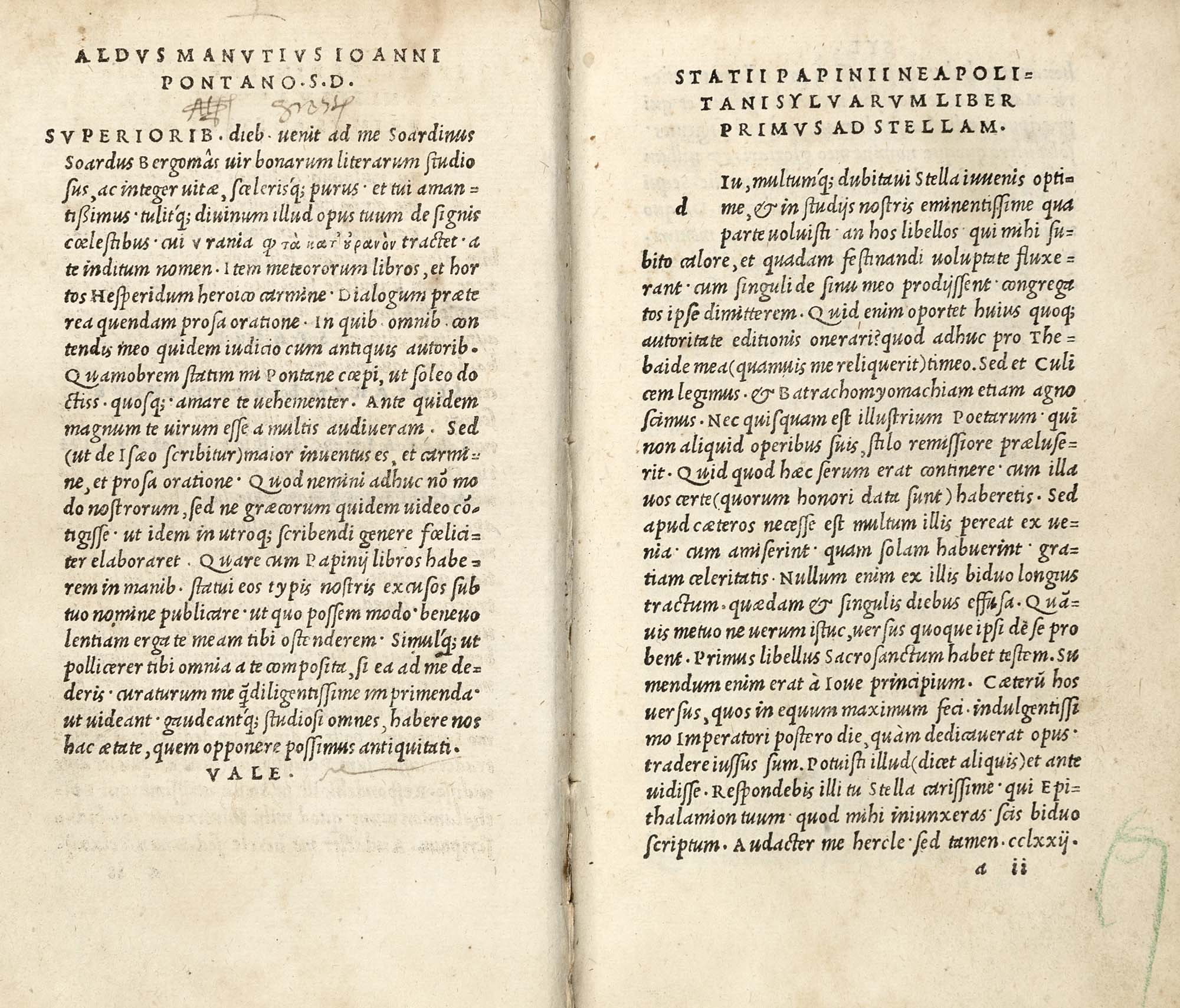 STATIUS, Publius Papinus (45 ca.- 96 ca.) - Statii Sylvarum Libri quinque Thebaidos libri duodecim Achilleidos duo.. Orthographia et Flexus dictionum graecarum omnium apud Statium.. Venezia: Aldo Manuzio, 1502.Prima edizione Aldina di queste opere del poeta latino di Napoli Publio Stazio. Il colophon della prima parte è datato novembre, mentre quello della seconda agosto.2 parti in un volume, 8vo (158 x 98mm). Ancora Aldina in fine, con bianca i8, spazi per capilettera con lettere-guida (alcune lievi e perlopiù marginali fioriture, piccolo foro di tarlo riparato al margine superiore o inferiore di alcune carte). Mezza pelle del XIX secolo, dorso decorato in oro (alcuni difetti, cuffia superiore staccata). Provenienza: Delvecchio (exlibris moderno).-ENSTATIUS, Publius Papinus (45 ca.- 96 ca.) - Statii Sylvarum Libri quinque Thebaidos libri duodecim Achilleidos duo.. Orthographia et Flexus dictionum graecarum omnium apud Statium.. Venice: Aldo Manuzio, 1502.First Aldine edition of this work by the Latin poet from Naples Publius Statius. The first colophon, at the end of the Thebaid, is dated November, and the second is dated August.2 parts in one volume, 8vo (158 x 98mm). Woodcut Aldine device at end, with blank leaf i8, spaces for guide-letters (some light and mainly marginal spotting, small repaired wormhole to top or bottom margin). 19th-century half calf, gilt spine (some light wear, top of spine detached). Provenance: Delvecchio (modern bookplate).