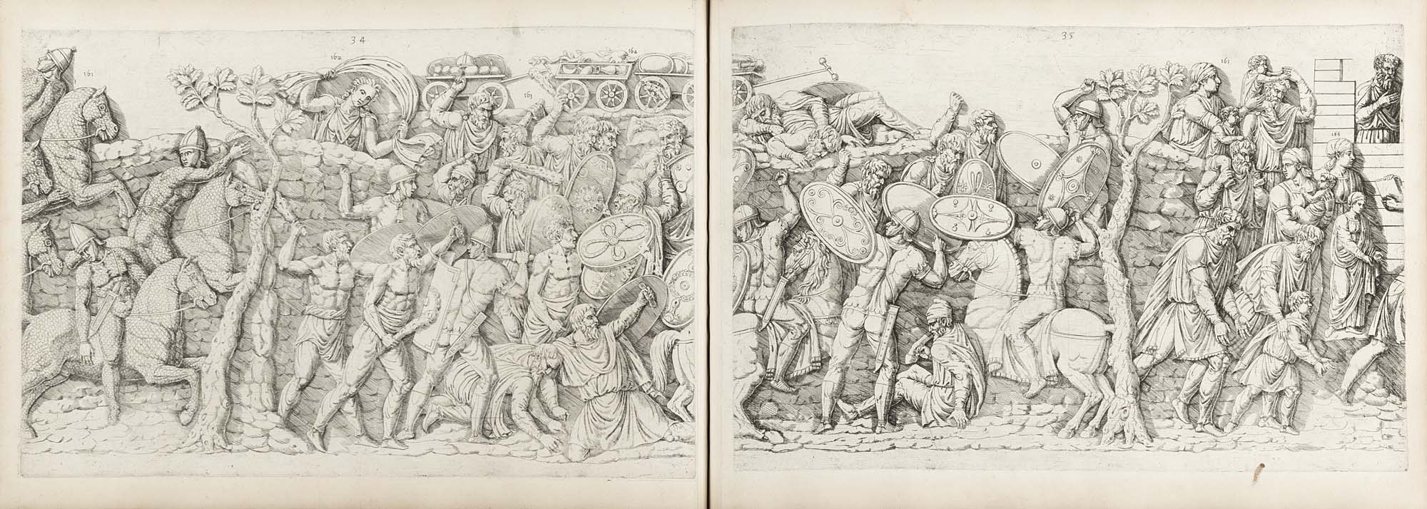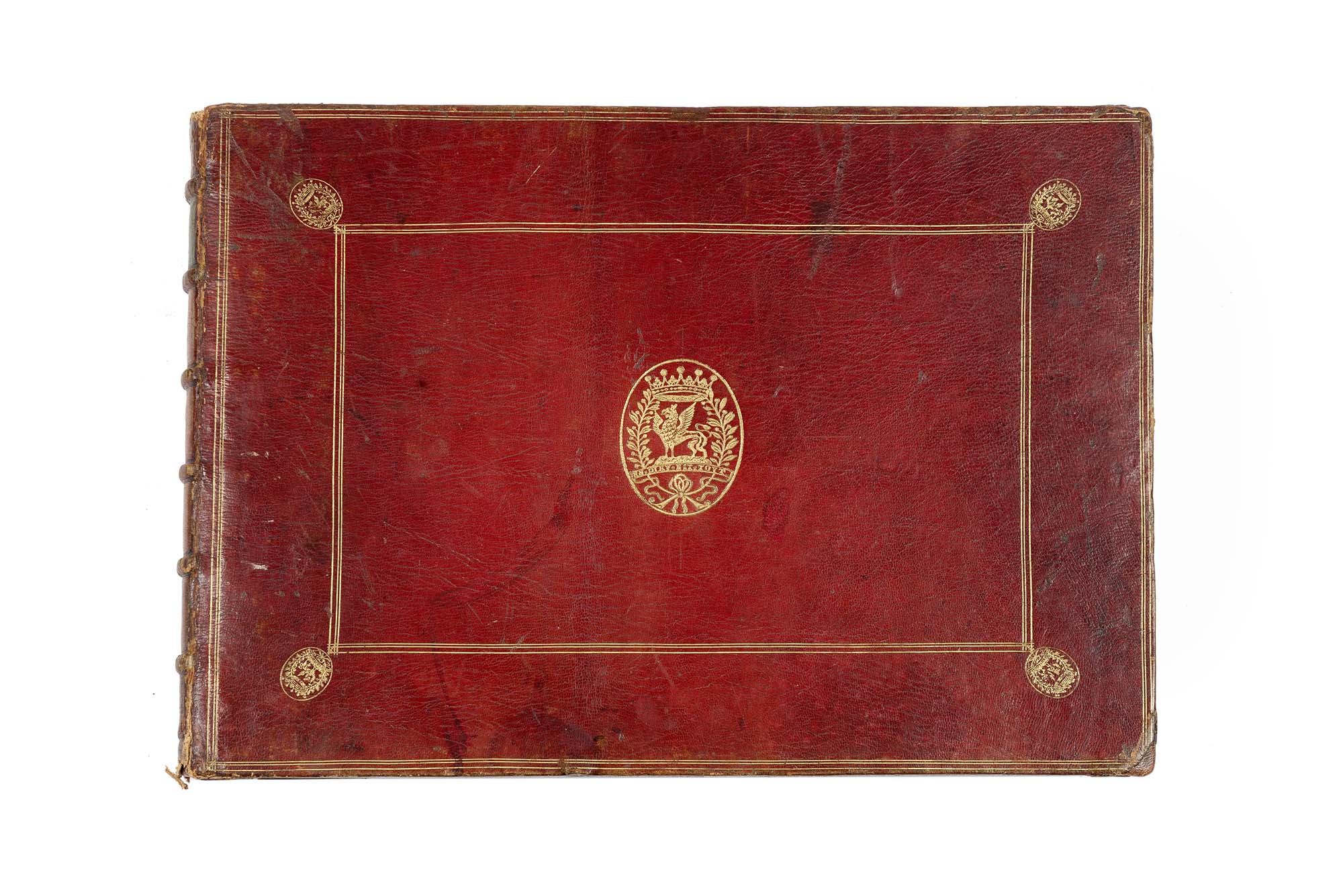 CIACCONE, Alfonso (1540-1599) - Historia utriusque belli Dacici a Traiano Caesare gesti, ex simulachris quae in columna eiusdem Romae visuntur collecta. Roma: Giacomo Mascardi, 1616.Affascinante copia in marocchino coevo alle armi di Thomas Wentworth, Lord deputato d'Irlanda condannato a morte nel 1641 per aver mosso in armi contro la Scozia senza l'avvallo del parlamento. Le 130 acqueforti sono quelle utilizzate nella prima edizione stampata a Roma, nel 1576.Folio oblungo (328 x 473mm). Vignetta xilografica al frontespizio, 130 tavole numerate, una tavola doppia che illustra la veduta e il prospetto della colonna e un foglio con al recto due tavole numerate 1 e 2 con le epigrafi e al verso i prospetti interni, tutte le tavole su brachette e i fogli di testo portati alla giustezza del libro (tavole 121 e 122 con strappo al margine della brachetta, senza perdite, ultima tavola con alcune riparazioni, le pagine di testo, occasionali lievi fioriture). Pregiato marocchino rosso coevo alle armi di Thomas Wentworth, tagli dorati (alcuni difetti alle estremità, più marcati al dorso e alle giunture). Provenienza: Wentworth, Thomas, 1st Earl of Strafford (1593 - 1641).-ENCIACCONE, Alfonso (1540-1599) - Historia utriusque belli Dacici a Traiano Caesare gesti, ex simulachris quae in columna eiusdem Romae visuntur collecta. Rome: Giacomo Mascardi, 1616.A fine copy in contemporary red morocco with the arms of Thomas Wentworh. The second edition of the series of engravings of Trajan's Column, first published in 1576 and one of the most remarkable Renaissance series of illustrations. Although the column became an important source for artists and historians, viewing details of the reliefs presented obvious difficulties. In 1569, the Brescian painter Girolamo Muziano (1532-92) had been granted permission to publish prints of the frieze, which are thought to have been based on the drawings of Jacopo Ripanda (fl. ca. 1500-16), one of the first artists to make a close study of the column from a basket suspended from the top of the column. Many Renaissance artists, including Raphael and Giulio Romano, drew inspiration from the reliefs for their depictions of antiquity. The triumphal column erected by the Roman senate in 113 A.D. to celebrate the victories of the emperor Trajan (died 117) over the Dacians is one of the best-preserved monuments of Imperial Rome. This was the first publication to include a full series of illustrations of the sculpted reliefs.Oblong folio (328 x 473mm). Engraved vignette on title, 130 numbered plates mounted on guards, one double-plate and 2 plates on a single leaf, the text leaves, which have their original white margin, have been mounted to fit the original size of the volume (plate 121 and 122 with a tear to guards without loss, final plate with some reparations, occasional spotting to text). Contemporary red morocco with the arms of Thomas Wentworth, decorated in gilt (extremities lightly rubbed).