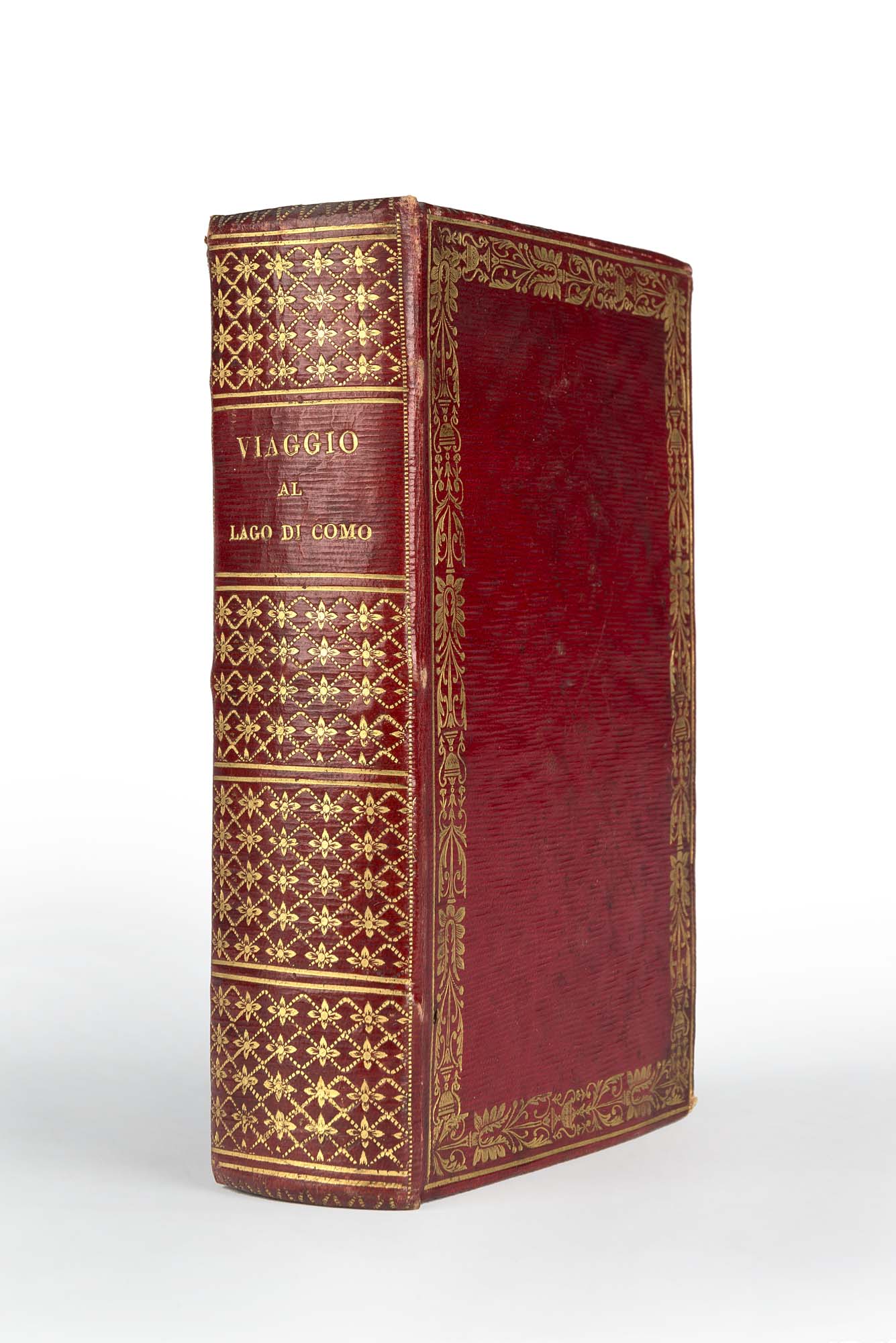 [COMO] - BERTOLOTTI, Davide (1784-1860) - Viaggio al lago di Como. Como: Carl'Ant.o Ostinelli, 1821.Elegante copia in bel marocchino rosso coevo finemente decorato in oro.16mo (149 x 100mm). Mappa del Lago di Como incisa in rame e ripiegata, 4 tavole in seppia con belle vedute del lago, la paginazione è come segue: I-V, verso bianco, 3-340 seguite da una pagina di errata con il verso bianco e da 2pp. di indice (mancano le pagine 1-2 a meno che non siano quelle dell'errata o dell'indice, piccolo strappo senza perdita alla mappa, frontespizio con riparazione e perdita dei dati di pubblicazione sostituiti a mano al margine inferiore, fioriture e occasionali macchie). Provenienza: F. Casella, Napoli (etichetta libraio) - Mario Carmenati (nota di possesso).-EN[COMO] - BERTOLOTTI, Davide (1784-1860) - Viaggio al lago di Como. Como: Carl'Ant.o Ostinelli, 1821.An elegant copy in fine contemporary red morocco decorated in gilt.16mo (149 x 100mm). Engraved folding map of Lake Como, 4 plates in sepia with views of the lake, the pagination is as follows: I-V, blank leaf, 3-340 followed by an errata leaf with its verso blank and a 2pp. index (missing pp. 1-2 unless these are either the index or the errata, small marginal tear without loss to map, title repaired with loss of imprint now in ink, some spotting and some occasional staining).