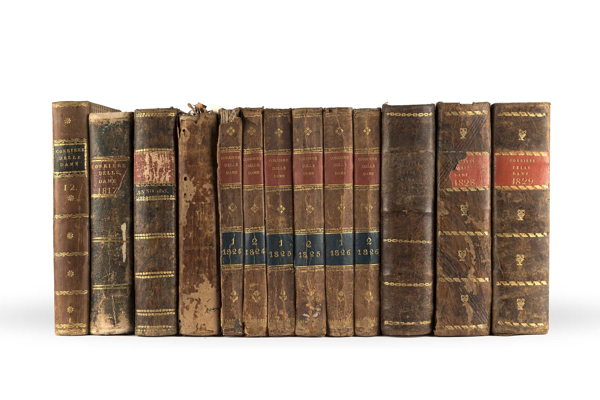 [CORRIERE DELLE DAME 1813-1818]. Una cospicua collezione di numeri del Corriere delle Dame, riccamente illustrato da numerossissime tavole a colori. 8vo. I volumi sono così composti: 1813 (tavole 467-479, 481-483, 485-518; è anche inserita una tavola del 1811 numerata 1149) - 1815 (tavole 572-622) - 1817 (tavole 676-727) - 1818 (tavole 728-7465, 747-748, 750-779, con inserita la tavola del 1814 numerata 559) - 1824-1826 (6 volumi senza tavole) - 1827 (tavole 2-10, 12-14, 16-17, 22 24, 25, 27, 30, 31, 34-39, 41-43, 45-47, 50-63, 65-68 e una seconda tavola n.2 in fine) - 1828 (tavole 1-5, 7-8, 10, 12-13, 15-18, 21-25, 27-29, 31-32, 3438, 40-44, 46, 48-49, 51-58, 60-63, 65, 67, 70-73) - 1829 (tavole 1-6, 8-9, 11-17, 19-24, 26-29, 31-36, 38-39, 41-48, 49-50, 53-77). (Alcuni occasionali pochi strappetti, un po' di tavole sciolte, tracce di polvere e bruniture). Legature coeve in pelle o mezza pelle (difetti). I volumi sono da esaminare e si vendono non passibili di storno.-EN[CORRIERE DELLE DAME 1813-1818]. - A large quantity of issuea of Corriere delle Dame, richly illustrated with numerous coloured plates. 8vo. The volumes include 1813 (plates 467-479, 481-483, 485-518; with a plate from 1811 numbered 1149) - 1815 (plates 572-622) - 1817 (plates 676-727) - 1818 (plates 728-7465, 747-748, 750-779, with a plate from 1814 numbered 559) - 1824-1826 (6 volumes without plates) - 1827 (plates 2-10, 12-14, 16-17, 22 24, 25, 27, 30, 31, 34-39, 41-43, 45-47, 50-63, 65-68 and a second plate n. 2 at end) - 1828 (plates 1-5, 7-8, 10, 12-13, 15-18, 21-25, 27-29, 31-32, 3438, 40-44, 46, 48-49, 51-58, 60-63, 65, 67, 70-73) - 1829 (plates 1-6, 8-9, 11-17, 19-24, 26-29, 31-36, 38-39, 41-48, 49-50, 53-77). (Few occasional small tears, some plates loose, some occasiona light soiling and browning). Contemporary calf or half calf (some wear). The lot is sold as viewed and sold not subject to return