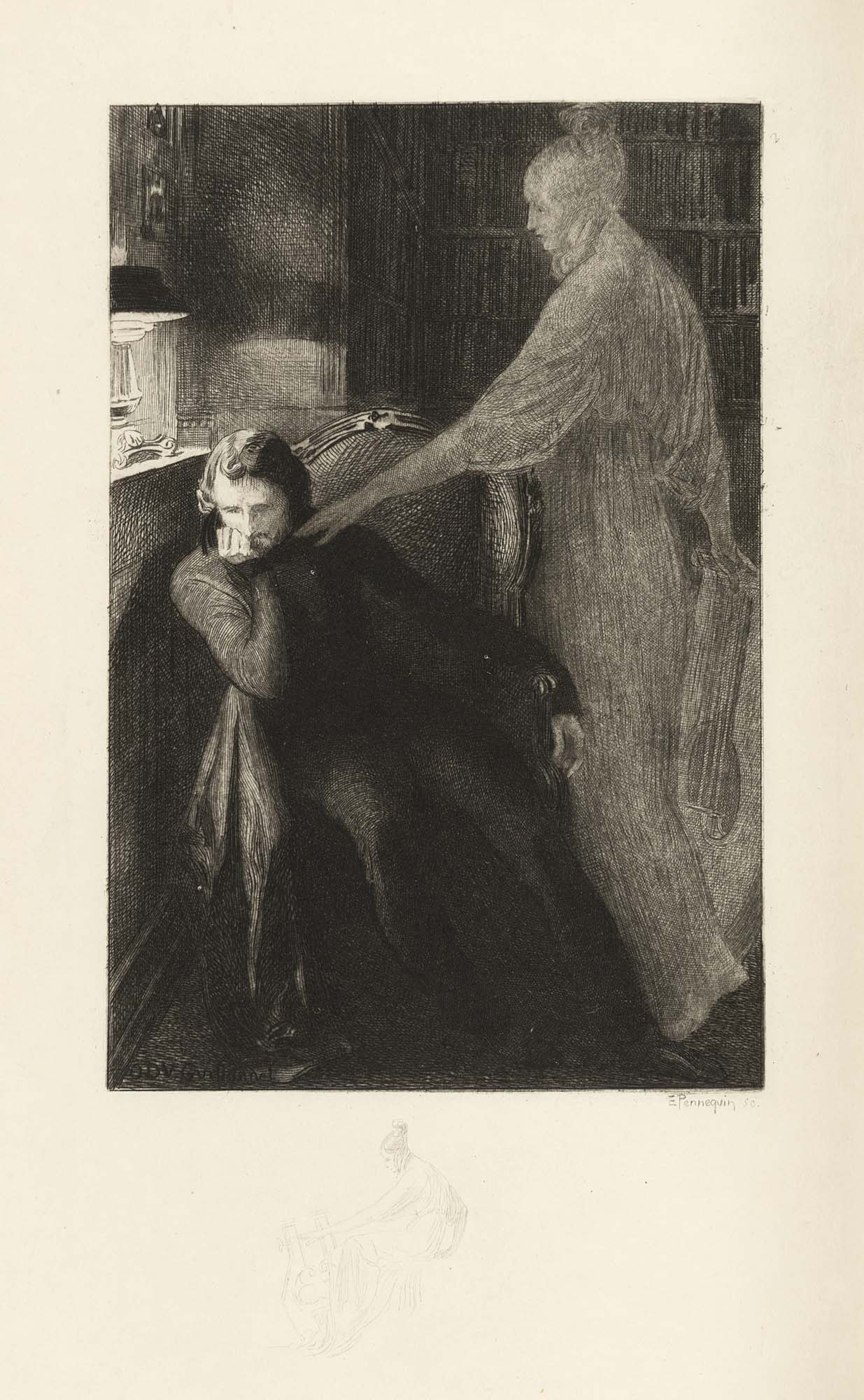 DE MUSSET, Alfred (1810-1857) - Edmond PENNEQUIN - Les nuits. Parigi: A. e F. Ferroud, 1912.Splendida copia di presentazione in pregiata legatura in marocchino bordeaux firmata da Gozzi. Esemplare riservato ai figli dell'editore F. Ferroud con inserita una lettera di presentazione da parte dell'incisore E. Pennequin su carta giapponese con acquaforte in due stati.8vo (225 x 155mm). Occhiello, acquaforte in doppio stato. Pregiata legatura in marocchino bordeaux firmato da Gozzi (Modena), fogli di guardia in velluto rosso e contropiatti in pelle blu decorata in oro, cofanetto uniforme e brossura originale preservata.-ENDE MUSSET, Alfred (1810-1857) - Edmond PENNEQUIN - Les nuits. Paris: A. e F. Ferroud, 1912.A splendid presentation copy in fine morocco by Gozzi reserved and dedicated to the children of the editor F. Ferroud. With a presentation letter tipped in by the engraver E. Pennequin, on Japan paper with the engraving in two states.8vo (225 x 155mm). Half-title, engraving in two states. Fine burgundy morocco by Gozzi (Modena), red velvet endleaves and inner pannels in blue leather decorated in gilt, uniform slipcase, with original wrappers preserved.