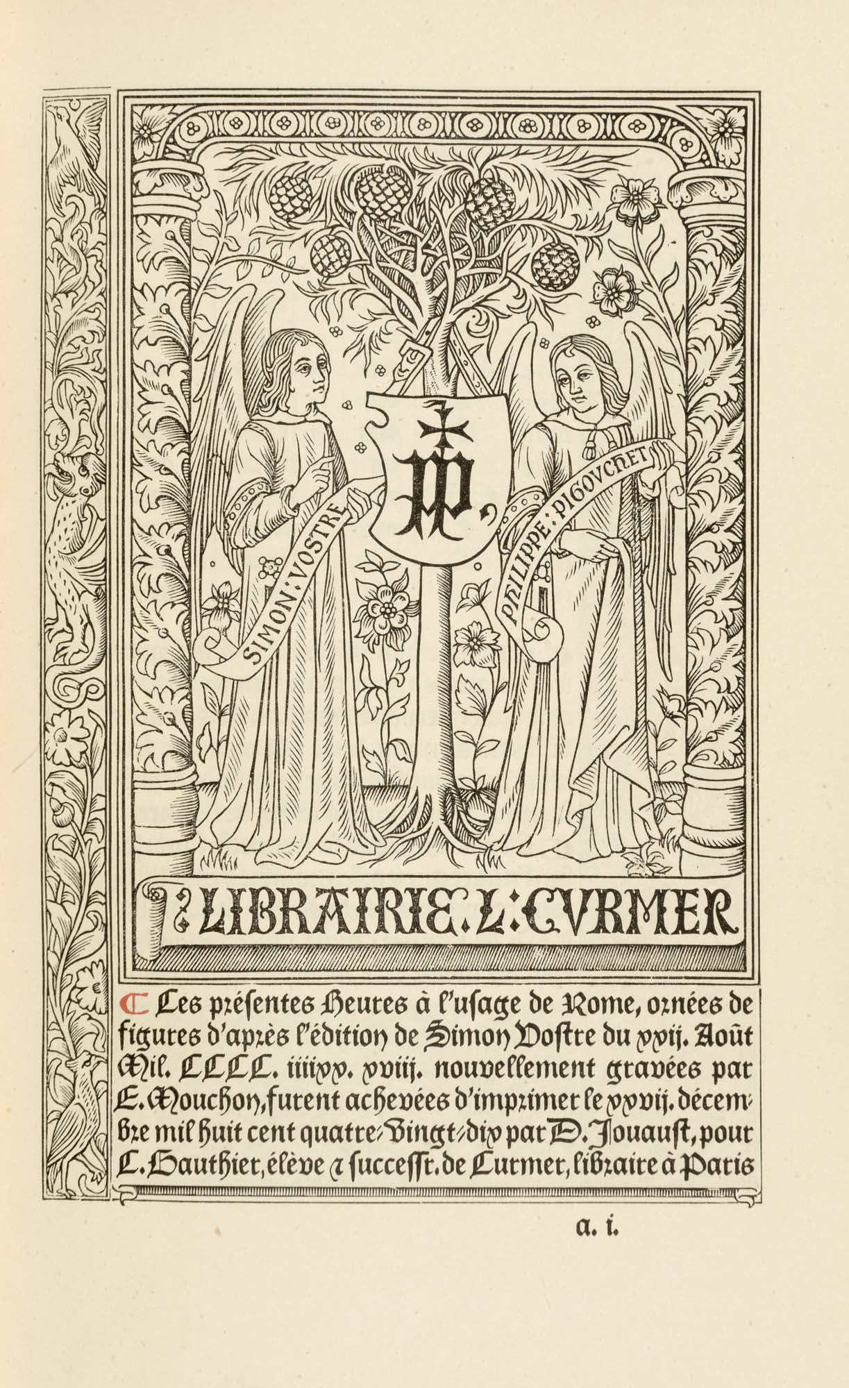 [LIBRO D'ORE - SIMON VOSTRE]. Ces présentes Heures à l'usage de Rome, ornées de figures d'après l'édition de Simon Vostre du 22 août 1498, nouvellement gravées par E. Mouchon. Parigi: D. Jouaust pour C. Gauthier, 1890.Pregiata riproduzione di questo libro d'ore originariamente stampato da Simon Vostre nel 1498. Copia in marocchino rosso coevo di Ch. Lanoé.8vo (192 x 129mm). Ogni pagina entro bordura xilografica e molte stampate in rosso e nero. Marocchino rosso coevo. Perfette condizioni.-EN[LIBRO D'ORE - SIMON VOSTRE]. Ces présentes Heures à l'usage de Rome, ornées de figures d'après l'édition de Simon Vostre du 22 août 1498, nouvellement gravées par E. Mouchon. - Paris: D. Jouaust pour C. Gauthier, 1890.A fine reproduction of this Book of Hours originally printed by Simon Vostre from 1498 in contemporary red morocco by Ch. Lanoé.8vo (192 x 129mm). Each page within xilographic border and many printed in red and black. Contemporary red morocco. Mint condition.