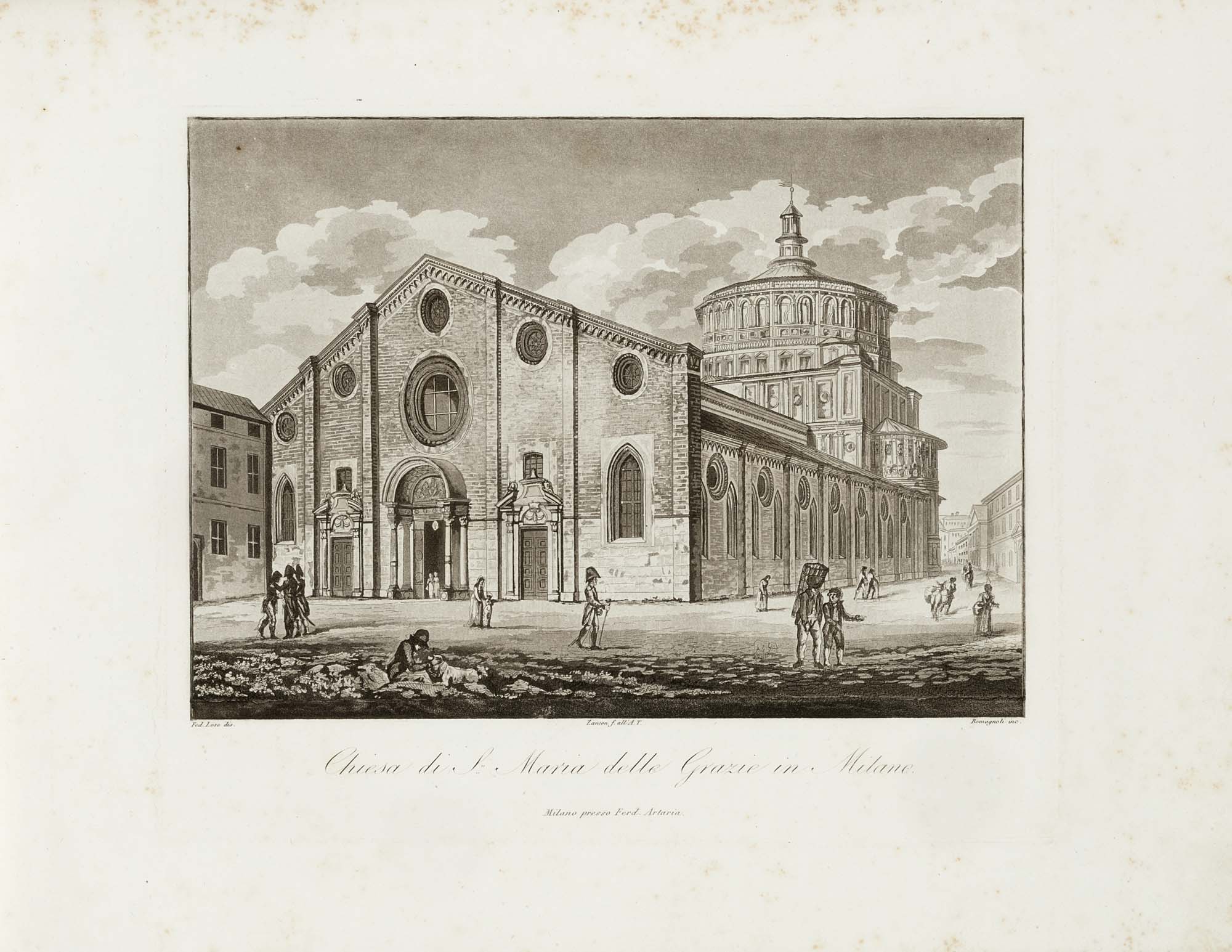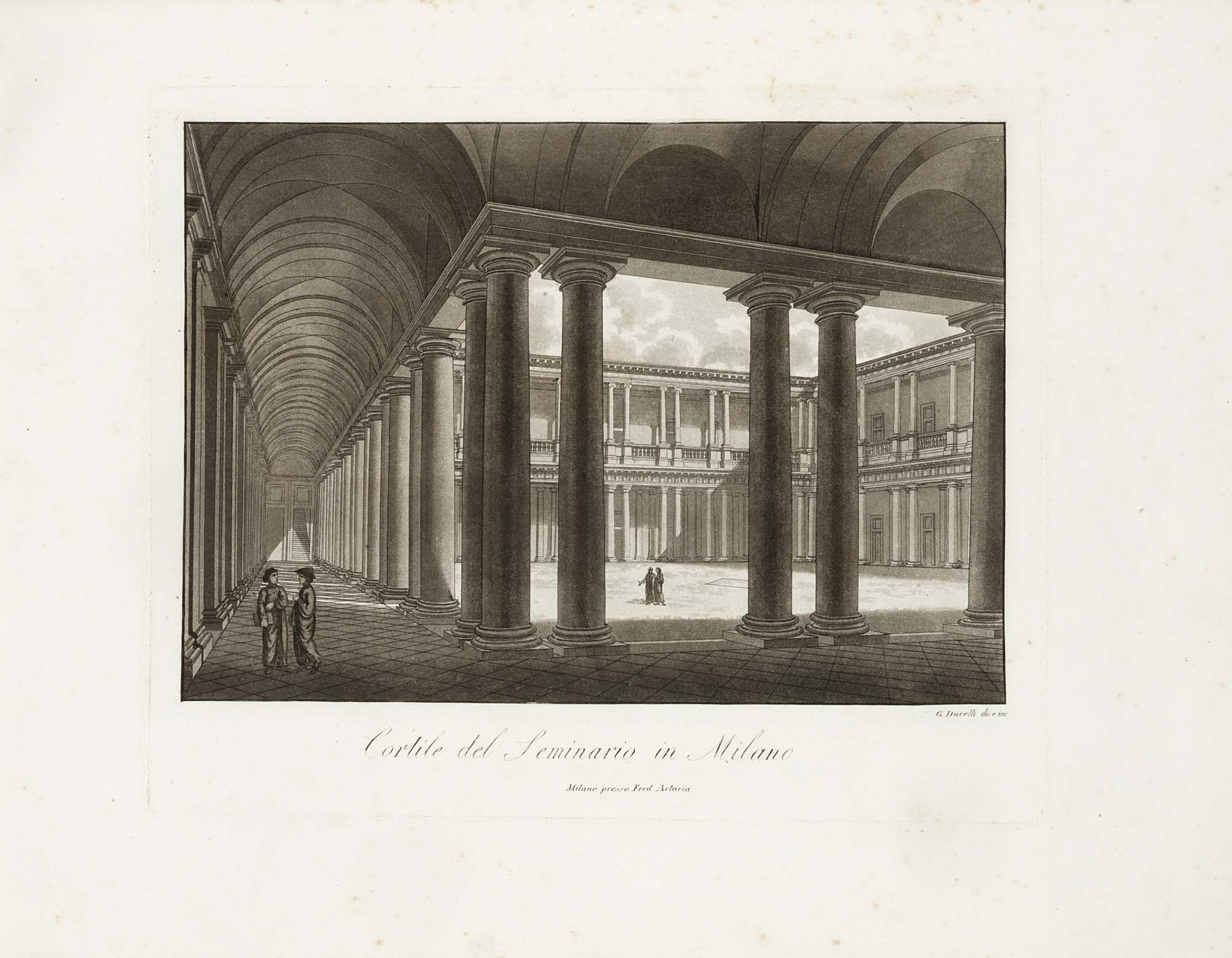 [MILANO - BIASOLI, Angelo (1790-1830) - LOSE, Federico e Carolina - Francesco DURELLI e altri] - [Vedute di Milano e località vicine disegnate da Federico Lose e da altri ed incise all'acquatinta da diversi]. [Milano: Ferdinando Artaria, 1816-1821].Splendido album contenente 25 vedute all'acquatinta ideate e incise dai migliori artisti del tempo quali Biasoli, Lose, Ambrosoli e Durelli.Folio oblungo (312 x 410mm). 25 vedute all'acquatinta (alcune marginali lievi fioriture all'inizio). Tela bordeaux originale con titolo in oro e decorazioni a secco (alcune macchie e graffi alle estremità).-EN[MILANO - BIASOLI, Angelo (1790-1830) - LOSE, Federico e Carolina - Francesco DURELLI e altri] - [Vedute di Milano e località vicine disegnate da Federico Lose e da altri ed incise all'acquatinta da diversi]. [Milan: Ferdinando Artaria, 1816-1821].A splendid album with 25 aquatint views of Milan and its sorroundings engraved by and after the best artists of the time Biasoli, Lose, Ambrosoli and Durelli.Oblong folio (312 x 410mm). 25 aquatint views (some marginal light foxing at beginning). Original bordeaux cloth with gilt title and blindstamped decorations (extremities rubbed).