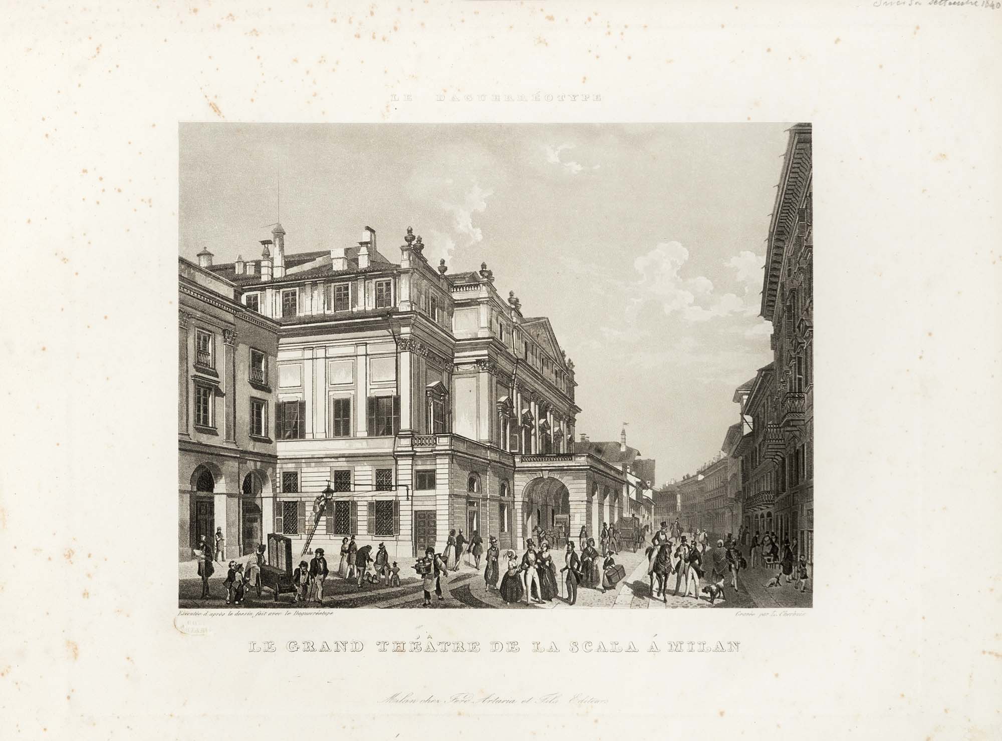 [MILANO] - CHERBUIN Luigi (1810-1875) - [Recueil des vues principales de Milan]. Milano: Arteria, c.a 1840.Raccolta di vedute incise da Cherubin per gli editori Artaria tra il 1841 il 1840 sulla base di daguerrotipi.Folio oblungo (260 x 345mm). 22 tavole all'acquatinta (su 23, privo del frontespizio, fioriture ai margini delle prime tavole). Legatura coeva in percallina bordeaux con "Milano" in oro al piatto (difetti, legatura fragile e parzialmente staccata). Provenienza: Ernestina Crennville (varie annotazioni, un invito ad un ballo presso la corte).-EN[MILANO] - CHERBUIN Luigi (1810-1875) - [Recueil des vues principales de Milan]. Milan: Arteria, c.a 1840.A collection of aquatint views realized by Cherbuin, one of the best artist of his time, from daguerrotypes between 1840 and 1841.Oblong folio (260 x 345mm). 22 plates in aquatint (of 23, without title, spotting to margins of first plates). Contemporary bordeaux percalline with gilt title on front panel (some rubbig, partially loose). Provenance: Ernestina Crennville (ball invite).