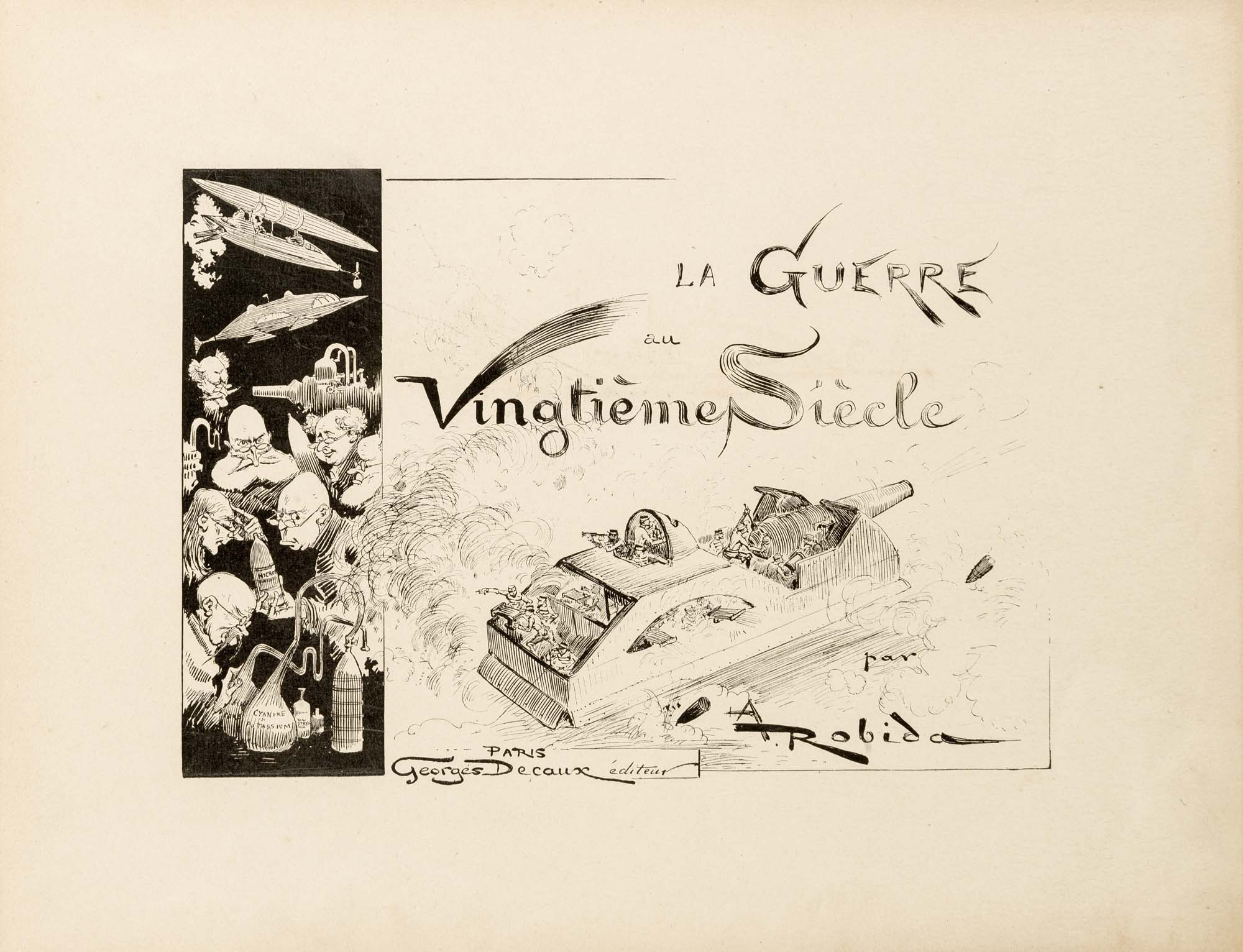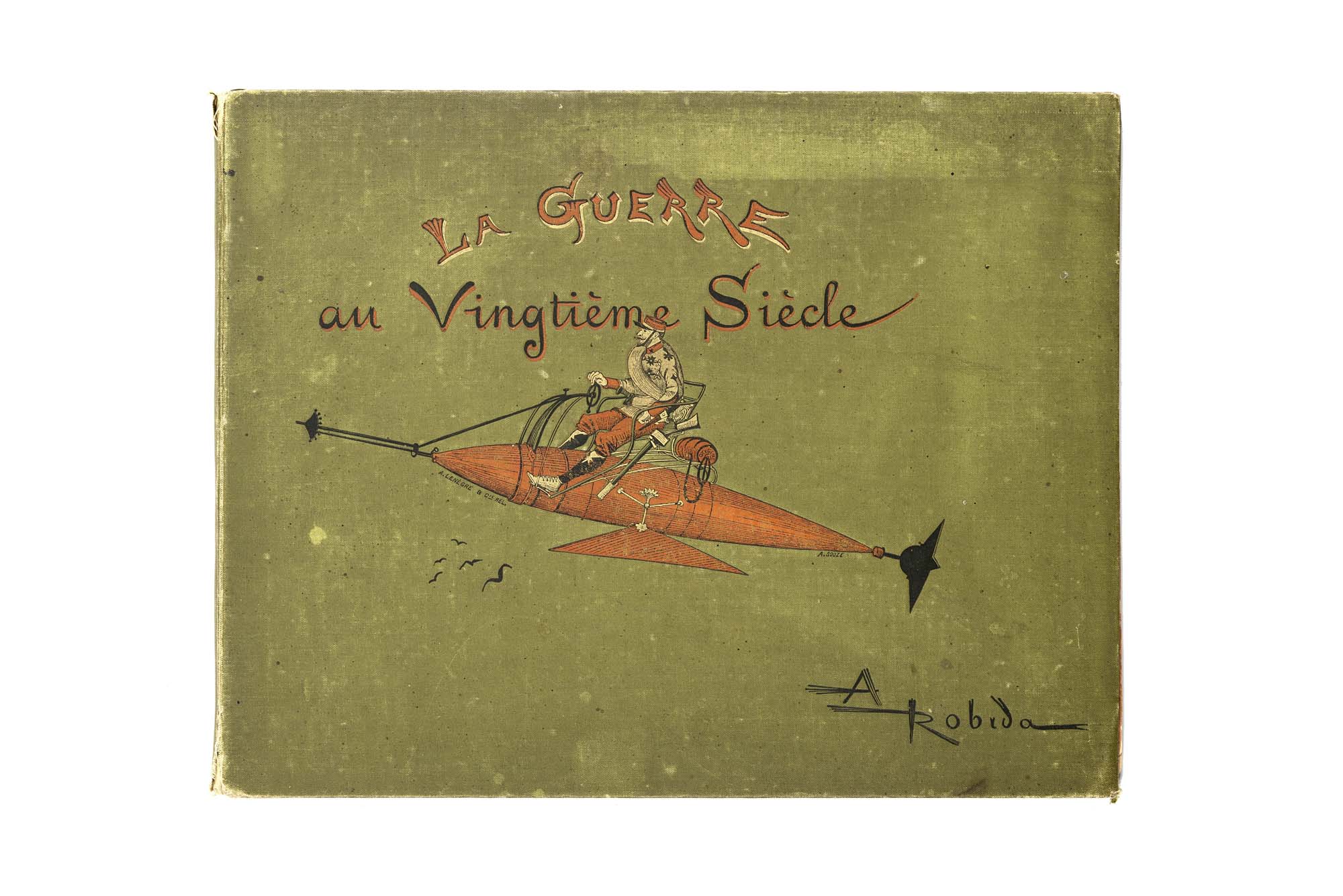 ROBIDA, Albert (1848-1926) - La guerre au vingtième siècle. Parigi: Georges Decaux, [1887].Rara opera del caricaturista francese che ha notevolmente influenzato la letteratura utopica successiva. I sommergibili, gli aerei e le armi chimiche tratteggiate da Robida, seppur fantasiose e caricaturali, anticipano le invenzioni belliche che vedranno la luce solo qualche decennio più tardi.Folio oblungo (320 x 245mm). Occhiello, frontespizio figurato, numerose illustrazioni nel testo, alcune a colori (nota bibliografica applicata all'occhiello). Legatura editoriale in percallina (difetti, legatura distaccata). Provenienza: ex libris Gallarati Scotti.-ENROBIDA, Albert (1848-1926) - La guerre au vingtième siècle. Paris: Georges Decaux, [1887].A rare work of the French caricaturist Robida. The depiction of submarines, airplanes and chemical weapons are imaginary but they anticipate some of the war machines which will be invented in the following decades.Oblong folio (320 x 245mm). Half-title, illustrated title, numerous illustrations, some in colour (bibliographical note on half-title). Original printed cloth (some wear, textblock detached).