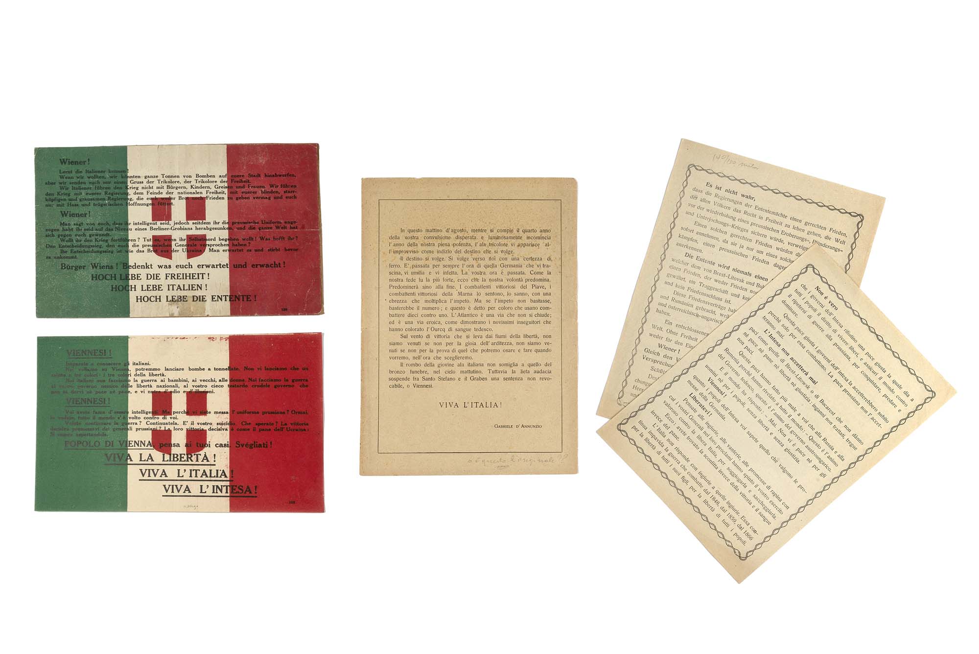 [D'ANNUNZIO Gabriele] - Volo su Vienna, lotto di 5 volantini: "Viennesi!"; "Wiener!"; "Non è vero"; "Es ist nicht wahr"; "In questo mattino d'Agosto". [Abano: Tipografia militare, 1918]. Iconico insieme dei volantini lanciati il 9 Agosto 1918 dai 7 apparecchi della squadriglia "La Serenissima" accompagnata dal Vate. Furono sganciati in totale 350.000 copie del volantino tricolore con il testo di Ugo Ojetti (presente in duplice copia, italiano e tedesco) 50.000 copie del testo preparato da D'Annunzio (presente) e 150.000 copie del volantino pacifista (presente in duplice copia, italiano e tedesco). Due aerei della Squadriglia rimasero a terra per problemi al motore e i volantini che avrebbero dovuto portare vennero ceduti alla crocerossa per le campagne di raccolta fondi; si è dunque portati a credere che la più parte dei volantini apparsi sul mercato provengano da queste vendite. L'esemplare del volantino di Ojetti redatto in tedesco è invece stato effettivamente lanciato sulla capitale austriaca come dimostra la nota con la data e l'ora del ritrovamento (Le 10 meno un quarto del 8 Agosto 1918, orario effettivo dello sgancio) scritte sul cartoncino di supporto a cui era stato affrancato (Provenienza: Vienna 1969 [si allega documentazione]). Affascinante e genuina testimonianza di uno dei più celebrati atti eroici dell'aviazione italiana e del Vate. 5 volantini (140 x 220mm) e (240 x 170mm) stampati su carta leggera (lievi arrossature e piccoli strappi). Si allega documentazione e due facsimili.-EN[D'ANNUNZIO Gabriele] - Volo su Vienna, lotto di 5 volantini: "Viennesi!"; "Wiener!"; "Non è vero"; "Es ist nicht wahr"; "In questo mattino d'Agosto". [Abano: Tipografia militare, 1918]. An iconic group of flyers throw over Wien on August 9, 1918 by the bombers of the squadron "La Serenissima" lead by D'Annunzio. 350.000 flyers were thrown carrying propagandistic messages. Most of the flyers sold on the market come from the two planes that for mechanical failures could not accomplish the mission. However, one of the flyers in this group was actually dropped as reported by the note on its back which reports the time in which it was found (Provenance: Vienna 1969). 5 flyers (140 x 220mm) and (240 x 170mm) printed on light paper (some foxing and little rips). Togehter with two facsimiles and provenance documents
