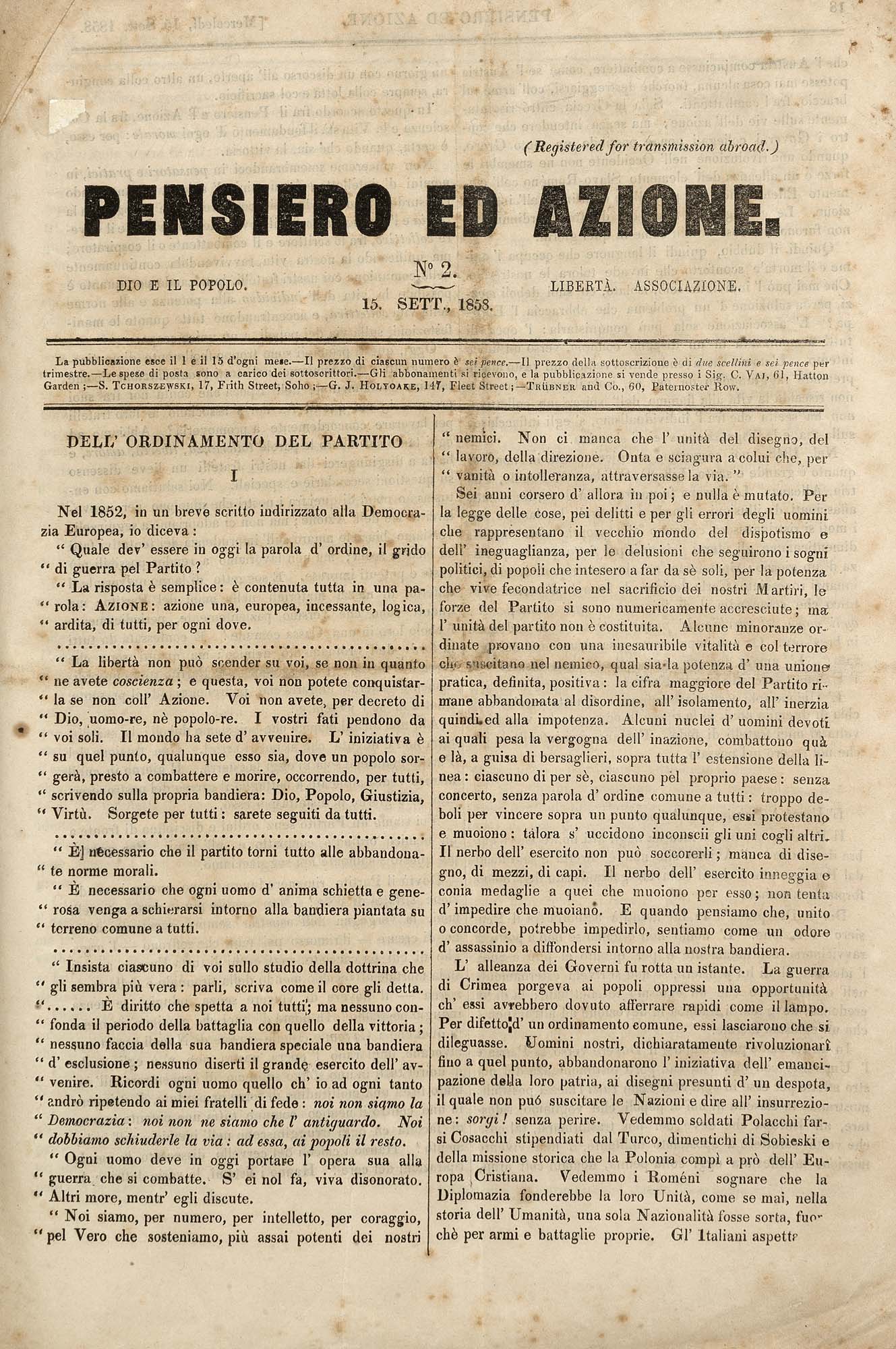 [MAZZINI Giuseppe] (1805-1872) - Pensiero ed Azione. Londra; Genova: Swietoslaw