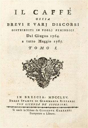 VERRI, Pietro (1728-1797) - Il Caffé ossia brevi e vari discorsi già distribuiti in fogli periodici. Brescia: Rizzardi, 1765-1766.Prima edizione del primo strumento di diffusione del pensiero illuminista in Italia. La rivista, che usciva ogni 10 giorni e che trattava di “cose varie, cose disparatissime, cose inedite, cose fatte da diversi autori, cose tutte dirette alla pubblica utilità”, poteva vantare la collaborazione dei più influenti pensatori lombardi del periodo tra cui: Alessandro Verri, Cesare Beccaria, Gian Rinaldo Carli e Paolo Frisi. Obiettivo della rivista era quello di avvicinare l'opinione pubblica e la nascente classe borghese alle scoperte e al pensiero illuminista tramite un rinnovamento e uno snellimento della lingua rifiutando gli echi classici e arcaizzanti della scuola classicista italiana.2 volumi, 4to (240 x 170mm). Vignette xilografiche al frontespizio, testo sue due colonne (qualche fioritura). Legatura coeva in cartonato, con titiolo manoscritto al dorso, esemplare parzialmente in barbe (perdita al dorso del primo volume, legatura allentata). (2)-ENVERRI, Pietro (1728-1797) - Il Caffé ossia brevi e vari discorsi già distribuiti in fogli periodici. Brescia: Rizzardi, 1765-1766.First edition of the first tool to spread the Italian Enlightment.2 volumes, 4to (240 x 170mm). Woodcut device on title, text on two columns (light spotting). Contemporary boards, manuscript title on spine, partially uncut (some loss to spine in vol. I, light wear). (2)