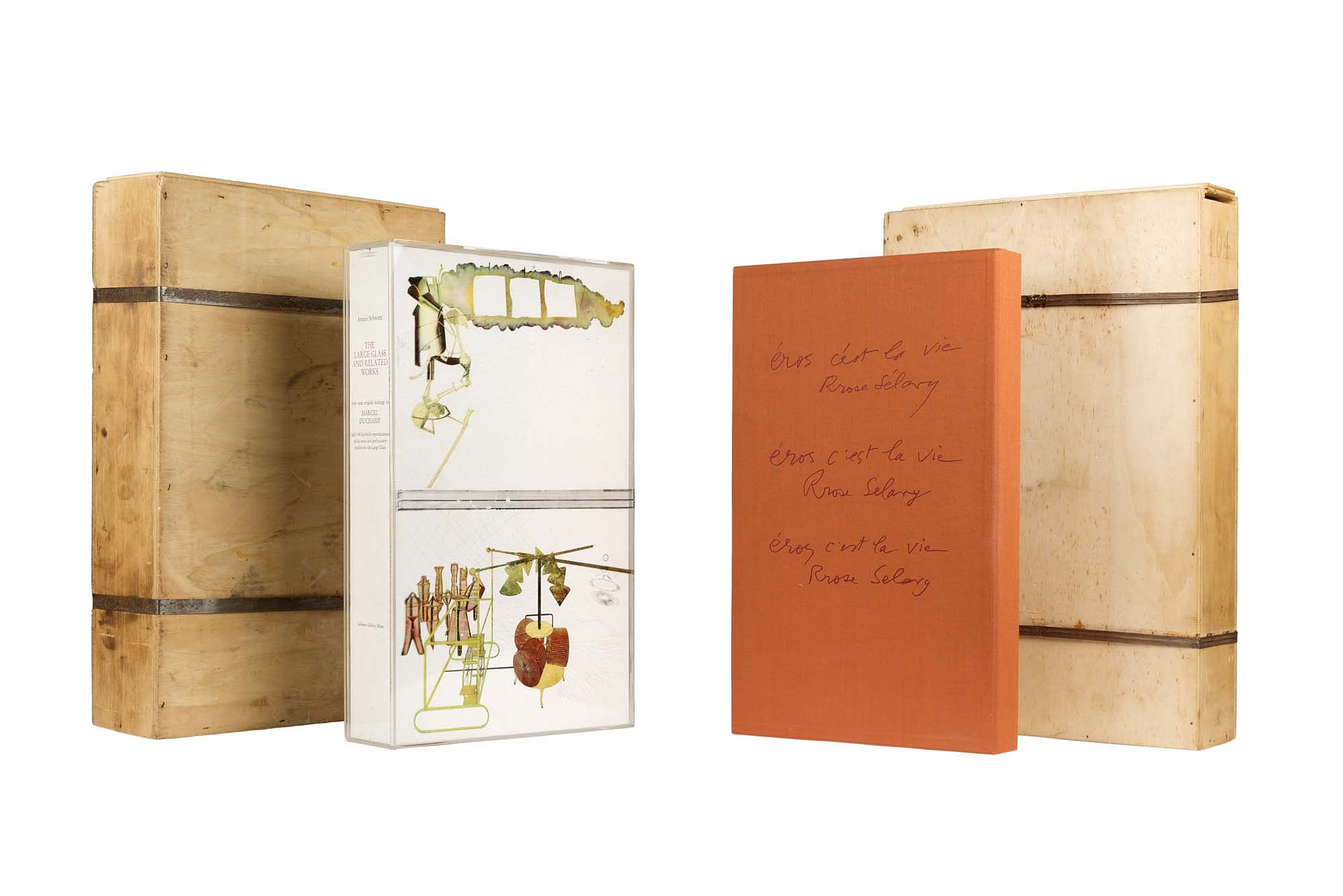 DUCHAMP, Marcel (1887-1968) - Arturo SCHWARZ (n. 1924) - The Large Glass and Related Works, Volumi I-II. Milano: Galleria Schwarz, 1967-68.L'edizione originale firmata da Marcel Duchamp e Arturo Schwarz. L'opera in 2 volumi è stampata su carta fabbricata a mano da Filicarta di Cologno Monzese. L'edizione è limitata a 150 copie di cui questa è la n. 104. Il testo è stampato in caratteri Bembo a cura di Ruggero Olivieri a Milano. Le note in facsimile furono stampate da Altiero Silva e le tavole incise nella pressa manuale di Giorgio Upiglio a Milano. Le tavole furono biffate appena terminata la pubblicazione nel 1967-68. In perfette condizioni e ancora nelle scatole originali in legno ideate per il trasporto.2 volumi, folio (425 x 260mm). 9 incisioni in ciascun volume di cui una con del rosso e due a doppia pagina. Entrambi i volumi in fogli sciolti contenuti entro i portfoli e cofanetti originali, il primo entro la scatola in plexiglass con la riproduzione dell'opera "Large Glass" a colori riprodotta sul pannello anteriore; il secondo entro la scatola editoriale arancione stampata in corsivo (lievissime macchie a un lato della scatola in plexiglass). Scatole originali in legno numerate "104" al dorso.-ENDUCHAMP, Marcel (1887-1968) - Arturo SCHWARZ (n. 1924) - The Large Glass and Related Works, Volumi I-II. Milan: Galleria Schwarz, 1967-68.The original edition signed by Marcel Duchamp and Arturo Schwarz. The work in 2 volumes is printed on handmade paper specially manufactured by Filicarta of Cologno Monzese, and limited to 150 copies signed by the artist and the author of which this is copy n. 104. The text is in Bembo type, printed by Ruggero Olivieri in Milan. The facsimile notes were printed in the lithographic plant of Altiero Silva. The etchings were pulled on the handpress of Giorgio Upiglio in Milan and the copper plates were barred after the printing was completed in 1967-68. In mint condition and still contained in their original wooden boxes designed for transportation.2 volumes, folio (425 x 260mm). Each volume with 9 etchings, one with red colouring and 2 double-page. Both volumes with loose sheets as issued, vol. I contained in original paper cover and white fabric-covered boards with printed spine and plexiglas slipcase with Large Glass reproduced in color on the front; vol. II in original orange linen-covered boards and slip case. Original wooden boxes.