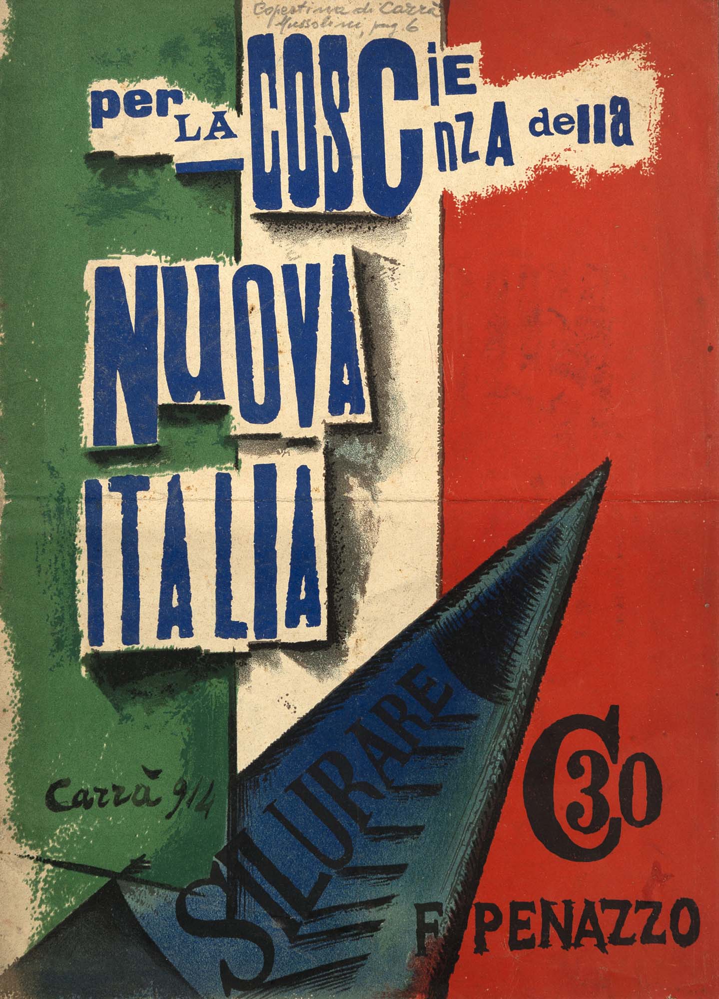 [FUTURISMO] - CARRA' Carlo (1881-1966) PENAZZO Francesco (1881-1966) - Per la coscienza della nuova Italia. Milano: A. Bertarelli, 1914.Opuscolo interventista del Dicembre 1914 con una bella copertina dai toni tricolore ideata da Carlo Carrà in pieno stile futurista.4to (275 x 195mm). Brossura editoriale (segni di piegatura verticale e orizzontale, testo distaccato dalla copertina).-EN[FUTURISMO] - CARRA' Carlo (1881-1966) PENAZZO Francesco (1881-1966) - Per la coscienza della nuova Italia. Milan: A. Bertarelli, 1914.Scarce nationalist pamphlet with the original futurist wrapper designed by Carlo Carrà.4to (275 x 195mm). Original wrappers (some creassing, text block detached from binding).