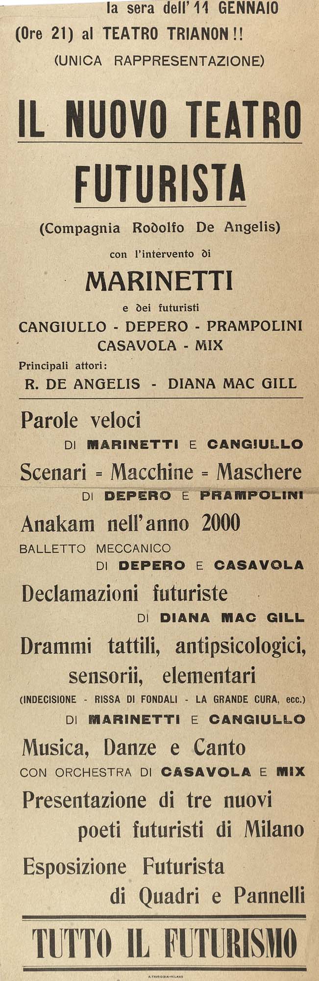 [FUTURISMO] - Il nuovo teatro Futurista. Milano: Taveggia, [1924] Rara locandina della serata d'esordio della compagnia del "Nuovo Teatro Futurista” in cui si rappresentò per la prima volta tra gli altri "Anakam (o Aniccham) del 2000" di Depero e Casavola e "Psicologia di macchine" di Prampolini e Mix. Importante testimonianza del teatro d'avanguardia futurista. (425 x 140mm). Locandina (segno di piegatura al centro).-EN[FUTURISMO] - Il nuovo teatro Futurista. Milano: Taveggia, [1924] - Scarce playbill of the opening night of "Nuovo Teatro Futurista" the futurist group. (425 x 140mm). Manifesto (some creassing).