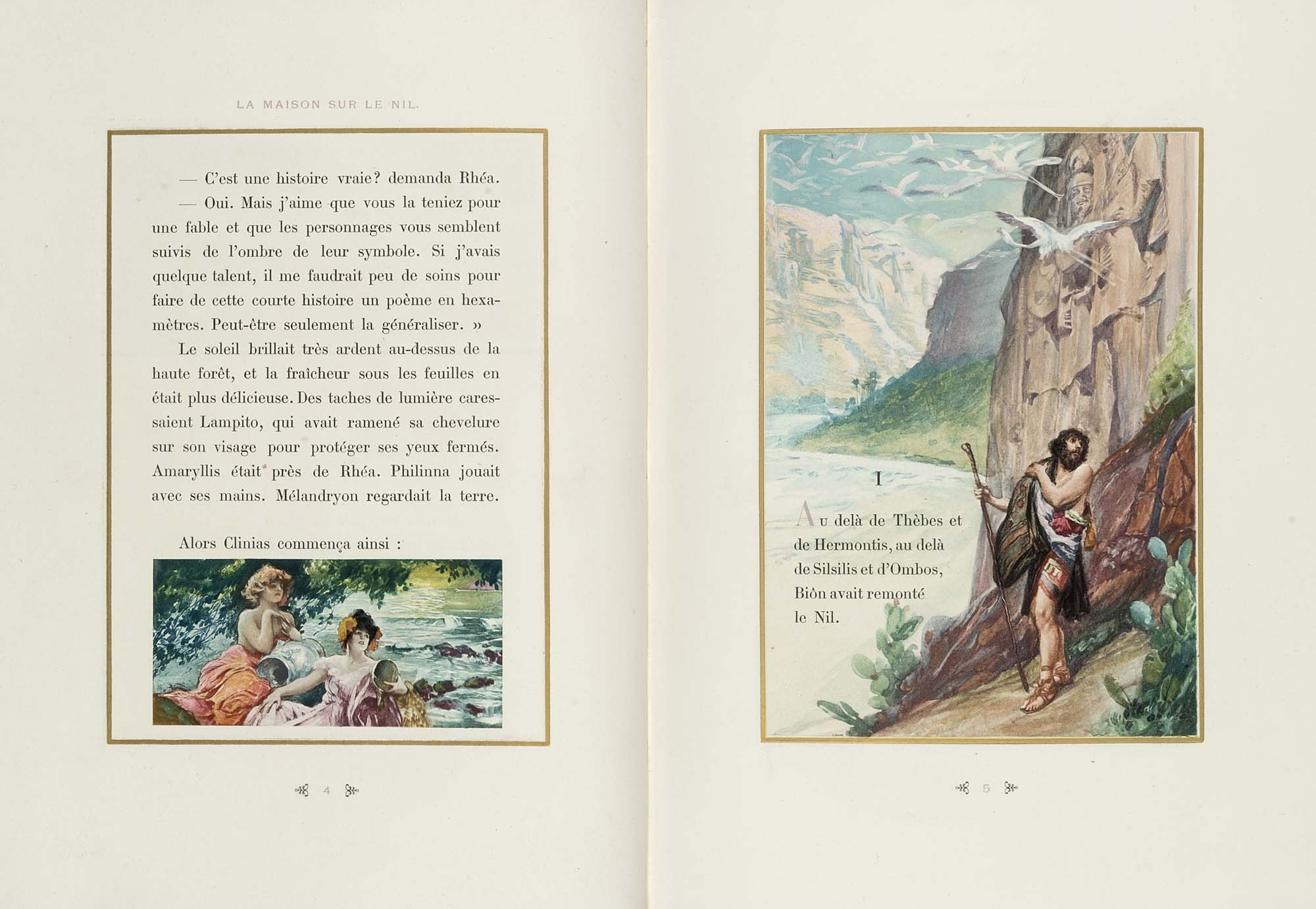 ROCHEGROSSE, Georges (1859-1938) - Paul GERVAIS (1816-1879) - Pierre LOUYS (1870-1925) - La Maison sur le Nil ou Les Apparences de la vertu [INSIEME A:] Ariane ou Le Chemin de la paix eternelle. Parigi: Charles Meunier, Maison du livre, 1904. Esemplari in perfette condizioni, le copie n. 67 di entrambe le opere da una tiratura limitata a 140 esemplari.2 opere in 2 volumi racchiuse in un cofanetto, 4to (285 x 212mm). Numerose illustrazioni a colori dei due artisti Rochegrasse e Gervais in ciasun volume. Legatura francese coeva in pelle decorata con titolo impresso in oro ai dorsi, preservati entro cofanetto (lieve difetto al cofanetto). (2)-ENROCHEGROSSE, Georges (1859-1938) - Paul GERVAIS (1816-1879) - Pierre LOUYS (1870-1925) - La Maison sur le Nil ou Les Apparences de la vertu [INSIEME A:] Ariane ou Le Chemin de la paix eternelle. Parigi: Charles Meunier, Maison du livre, 1904. Copies in mint condition, both n. 67 from a limited edition of 140.2 works in 2 volumes preserved in a slipcase, 4to (285 x 212mm). Numerous coloured illustrations by the two artists Rochegrasse and Gervais in both volumes. French contemporary decorated calf, spines decorated in gilt, preserved in a matching slipcase. (2)
