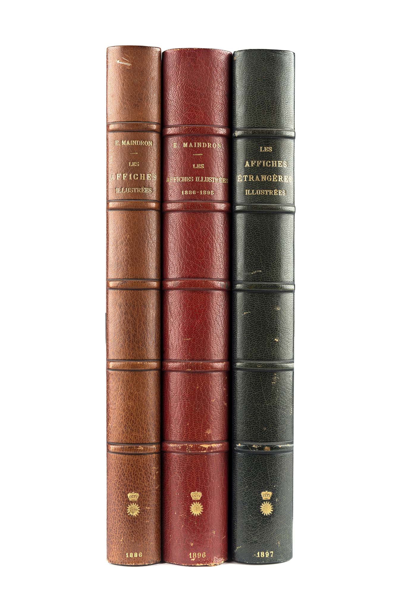 [TOULOUSE LAUTREC - CHERET - MUCHA - GRASSET e altri ] - MAINDRON, Ernest (1838-1907) - Les Affiches illustrées. Parigi: H. Launette & Cie, 1886, 1896, 1897.Pregiate copie su carta velina in mezzo marocchino coevo di Thierry de Petit-Simier con le brossure originali preservate all'interno. Il primo volume è il n. 431 di 525, il secondo è un esemplare di dedica senza dedicatario, senza giustificazione e ancora con gli indicatori di taglio ai margini delle tavole. Il terzo è il n. 987 di 1,000.3 volumi, folio (315 x 224mm). Numerosissime illustrazioni nel testo, tavole cromolitografiche e litografiche. Mezzo marocchino coevo di Thierry de Petit-Simier, il primo volume marrone, il secondo rosso e il terzo blu, dorsi e tagli superiori dorati (dorsi leggermente schiariti, minimi graffi agli angoli del vol. II). (3)-EN[TOULOUSE LAUTREC - CHERET - MUCHA - GRASSET e altri ] - MAINDRON, Ernest (1838-1907) - Les Affiches illustrées. Paris: H. Launette & Cie, 1886, 1896, 1897.Very fine copies on papier velin in contemporary half morocco by Thierry de Petit Simier with the original wrappers preserved. Vol. I is n. 431 of 525, vol. II is a dedication copy without dedicatee, justification and still with the printer's plate margins. Vol. III is n. 987 of 1,000.3 volumes, folio (315 x 224mm). Numeours illustrations in text, chromolithographic and lithographic plates. Contemporary half morocco by Thierry de Petit-Simier, vol. I in brown, vol. II in red and vol. III in blue, spines and top edges gilt (spines lightly faded, minor rubbing at corners of vol. II). (3)