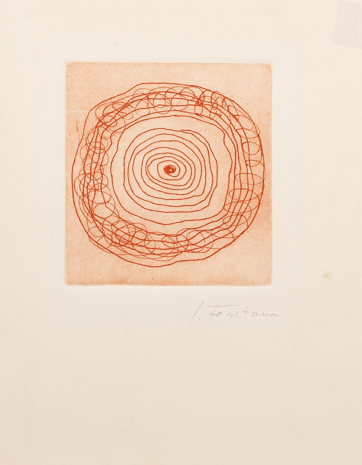 FONTANA LUCIO (1899 - 1960) Senza titolo. 1966. Acquaforte e acquatinta. Cm 16,00 x 21,00. Firma a matita in basso a destra. Dimensioni lastra: 9,5x8,8 cm. Da un edizione totale di 100 + 10 hc contenute singolarmente nel secondo volume de "L'eredità di Dante" di Luigi Cavallo. Stampatore: Giorgio Upiglio, Milano. Bibliografia: Ruhé & Rigo, Lucio Fontana Graphics, E-33-34. Presenti lievi difetti.