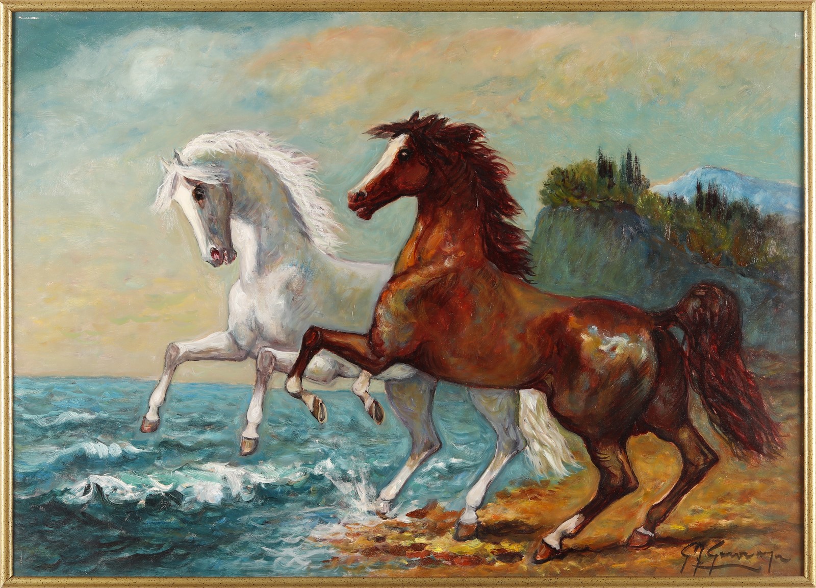 GONZAGA GIOVAN FRANCESCO (1921 - 2007) I due Corsari. Olio su tela . Cm 70,00 x 50,00. Firma in basso a destra. Al retro titolo e firma. Autentica dell'artista su fotografia. Cornice presente