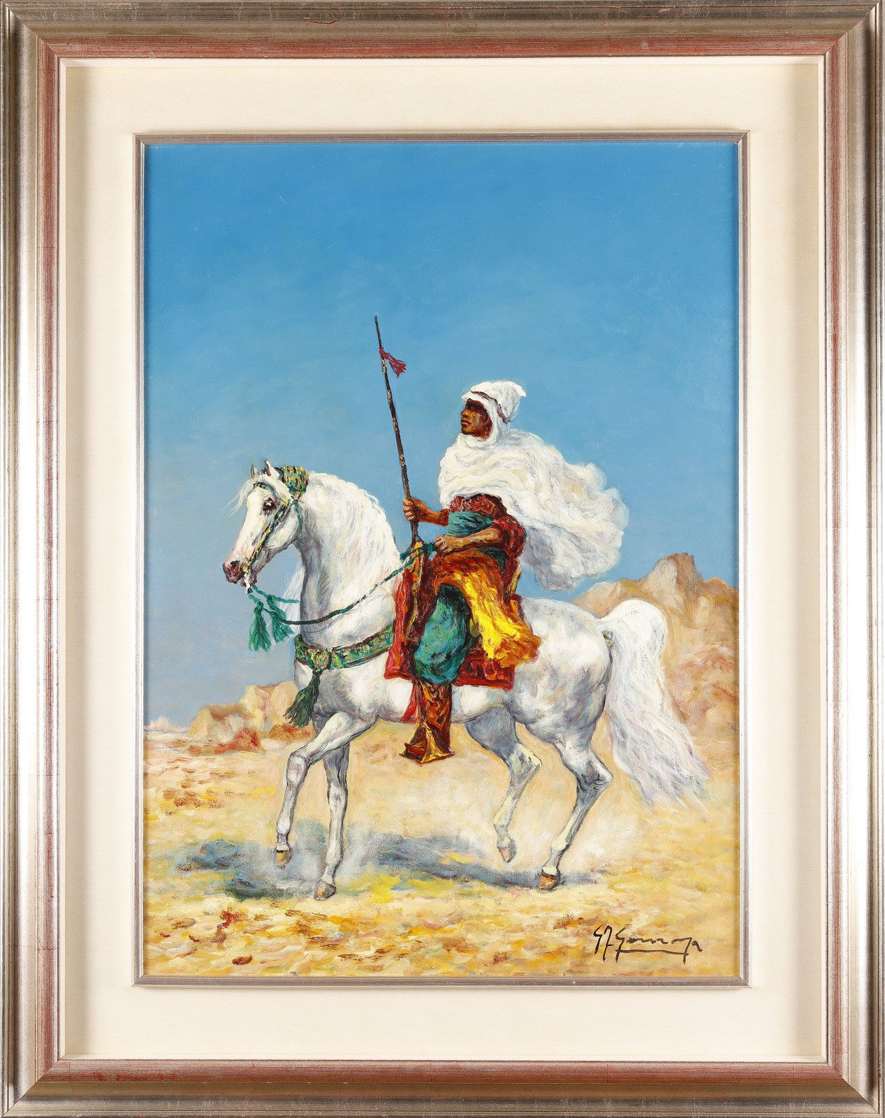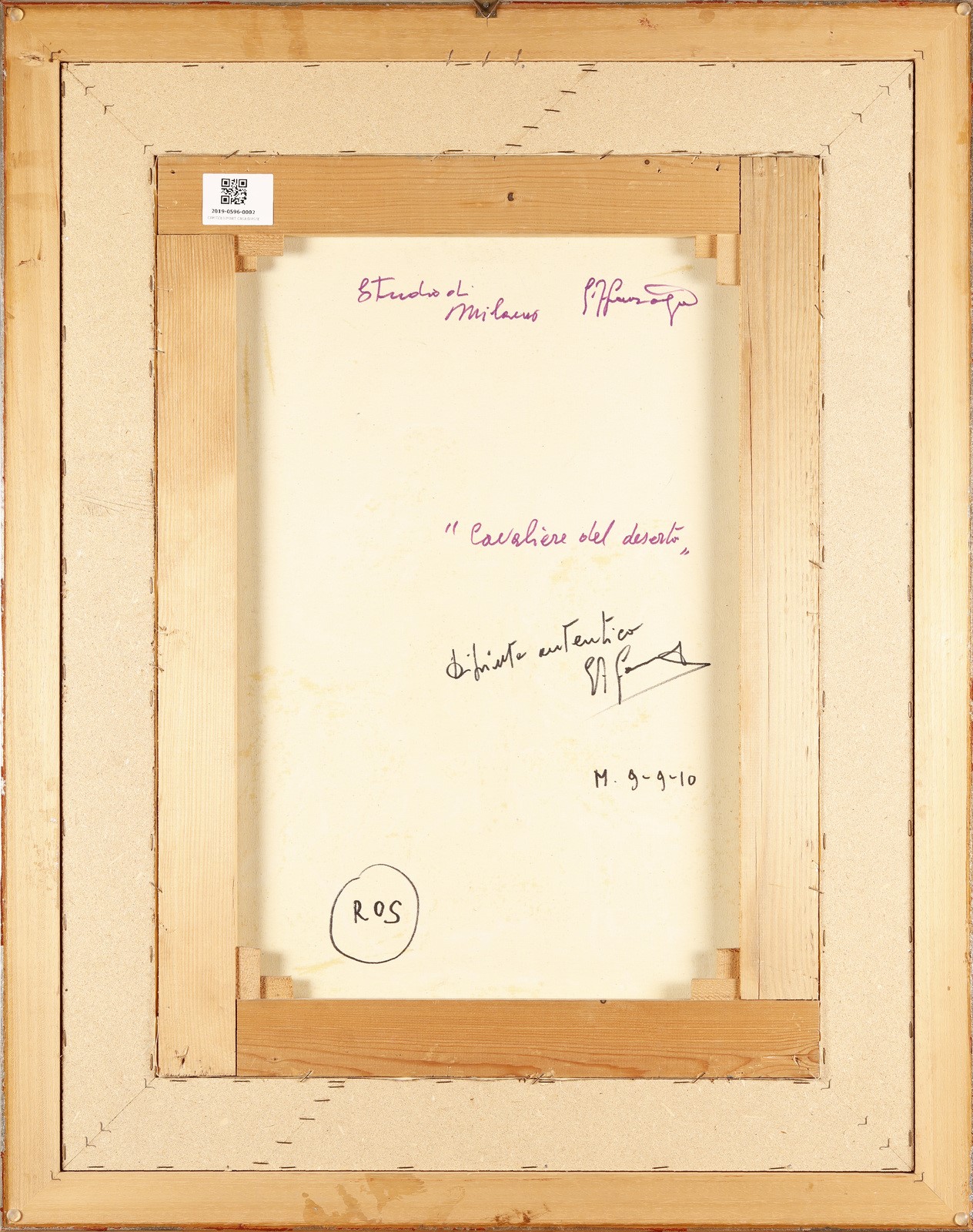 GONZAGA GIOVAN FRANCESCO (1921 - 2007) Il cavaliere del deserto. Olio su tela . Cm 50,00 x 70,00. Firma in basso a destra. Al retro titolo e firma. Autentica dell'artista su fotografia. Cornice presente