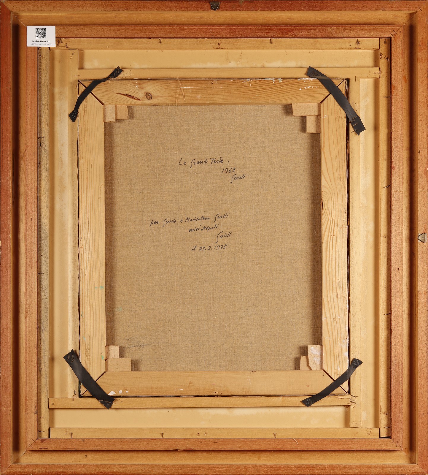 GUIDI VIRGILIO (1891 - 1994) Le grandi teste. Olio su tela . Cm 50,00 x 60,00. Al retro titolo, firma, anno e dedica. Presenti lievi difetti. Bibliografia: Franca Bizzotto, Dino Marangon, Toni Toniato - Virgilio Guidi, Catalogo generale dei dipinti, Volume secondo, Electa, pag. 986, n.1968-92. Proveienza: Galleria Del Corso, Latina; Collezione Le Pera, Cosenza; Collezione Vena, Cosenza. Cornice presente