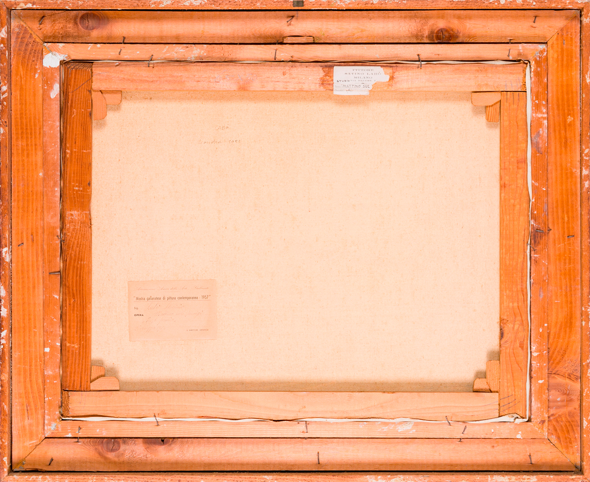 Etichetta della Mostra gallaratese di Pittura contemporanea - 1957 - Associazione Amici dell'Arte - Gallarate con caratteristiche tecniche dell'opera e iscrizione 'Terzo premio', al retro