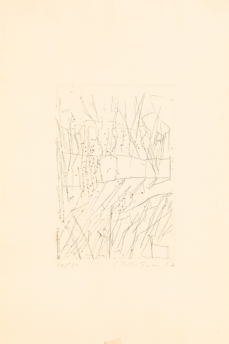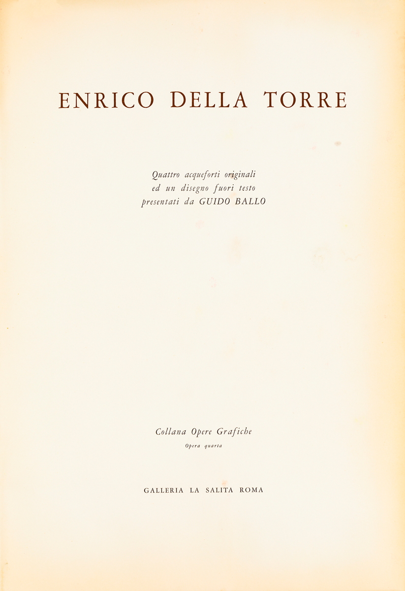 Cartella composta da colophon di presentazione con numerazione (Esemplare 26/30), testo introduttivo di Guido Ballo, 4 acqueforti di Enrico Della Torre, ciascuna delle quali recante firma, datazione e numerazione (Esemplari26/30) a matita al fronte e un disegno fuori testo realizzato a biro su carta e recante firma al fronte