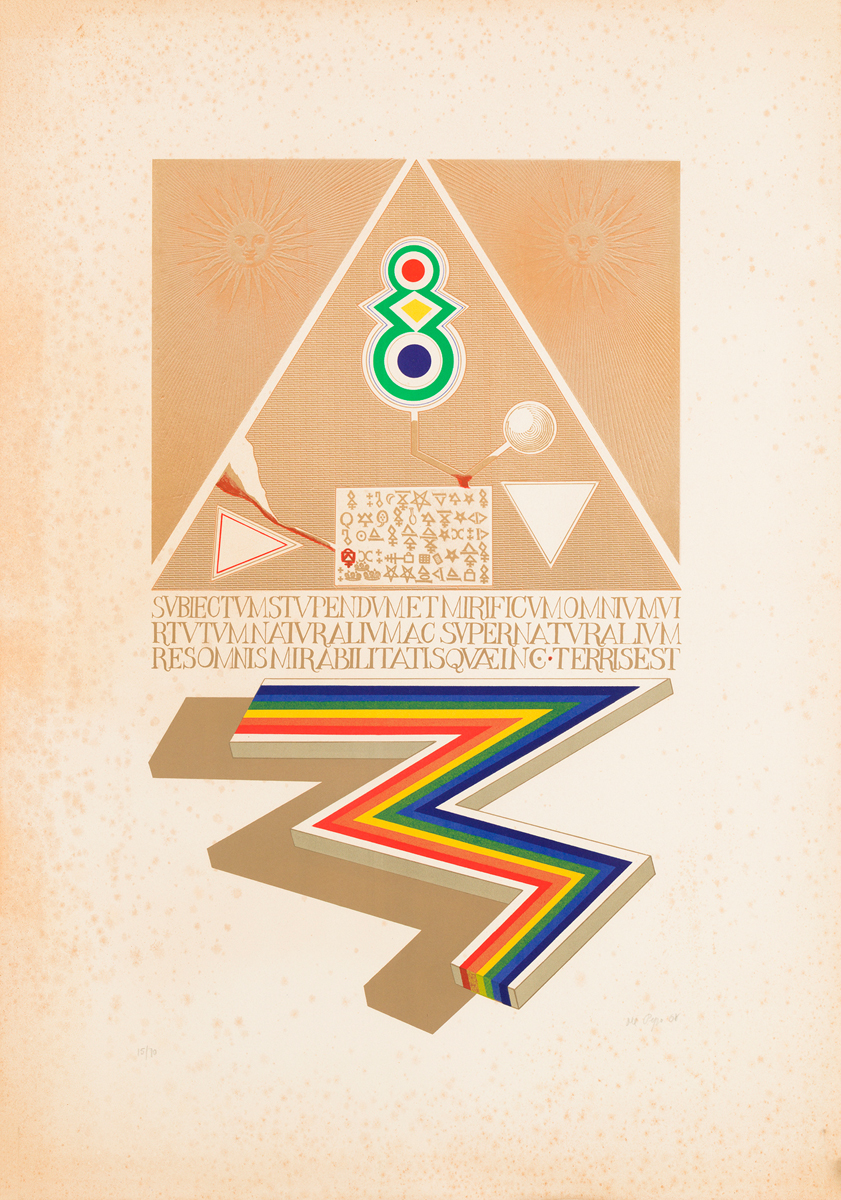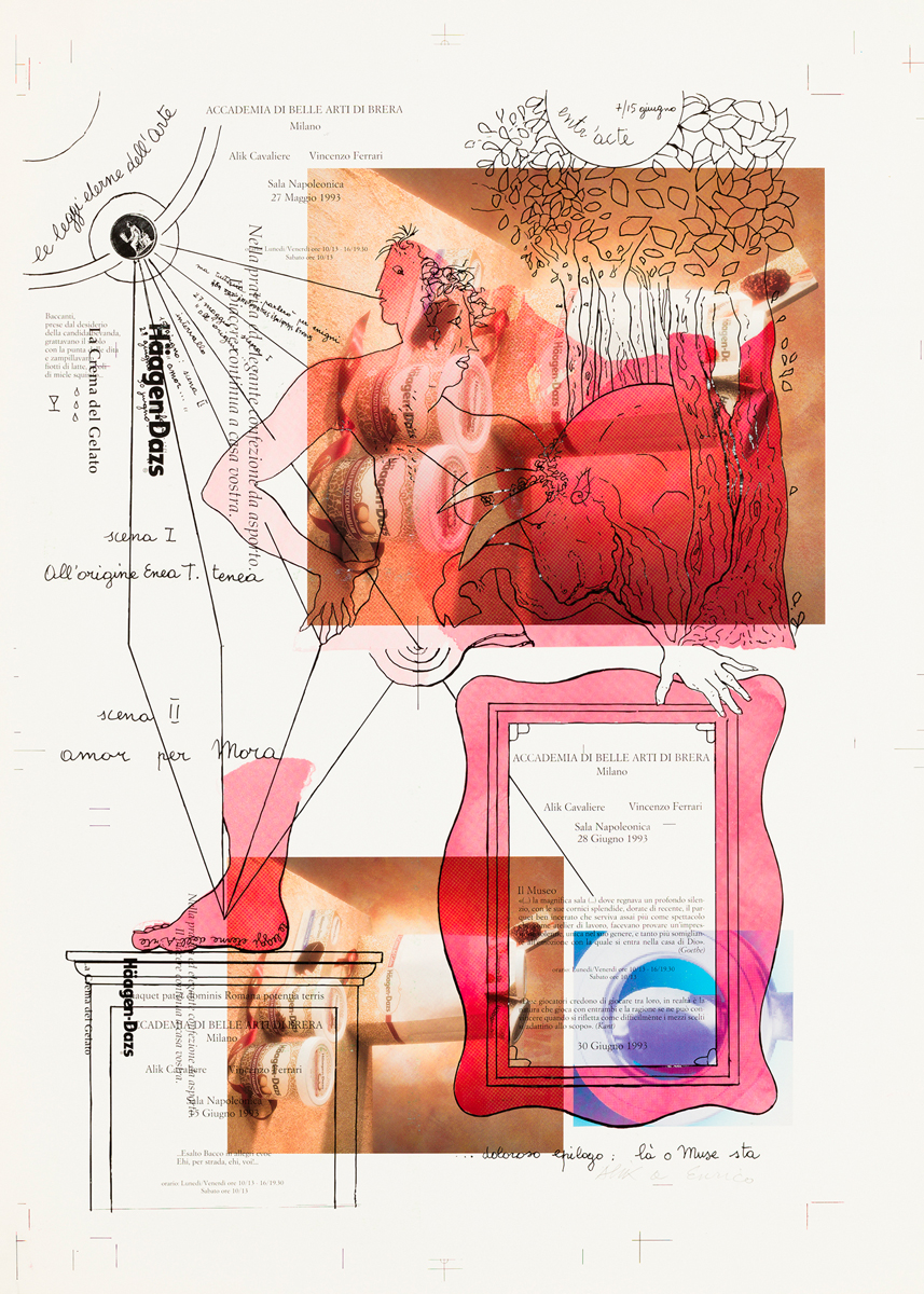 Manifesto edito in occasione dell'esposizione 'Alik Cavaliere. Vincenzo Ferrari' tenutasi nel 1993 presso Sala Napoleonica - Accademia di Belle Arti di Brera, Milano