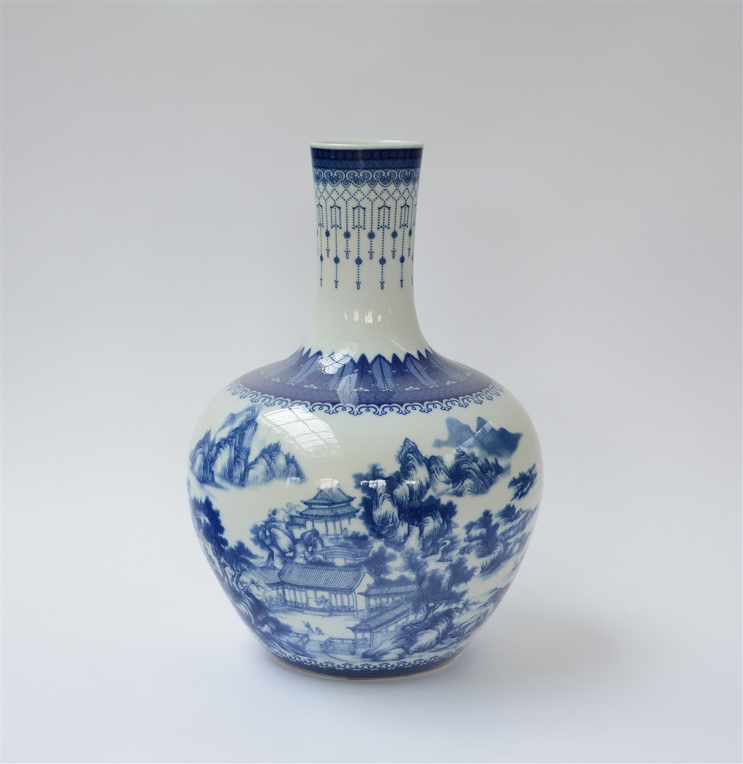 Grande vaso a bottiglia in porcellana bianca e blu decorata con paesaggio...