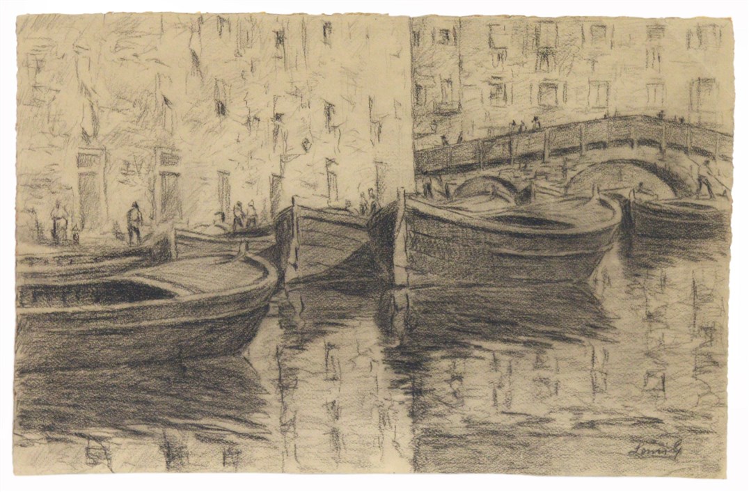 "Scorcio di Venezia" disegno a carboncino (cm 43x66) Firmato in basso a destra (difetti)