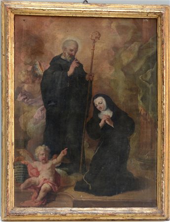 Scuola del secolo XVIII "Suora in preghiera con frati e putti" olio su tela...
