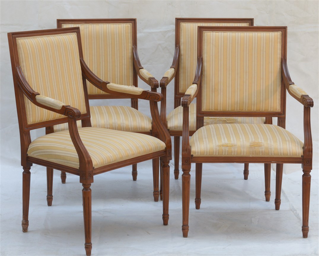 Gruppo di quattro poltrone in stile luigi XVI, braccioli e montanti curvi, gambe tornite e scanalate, rivestite in tessuto a righe (difetti)