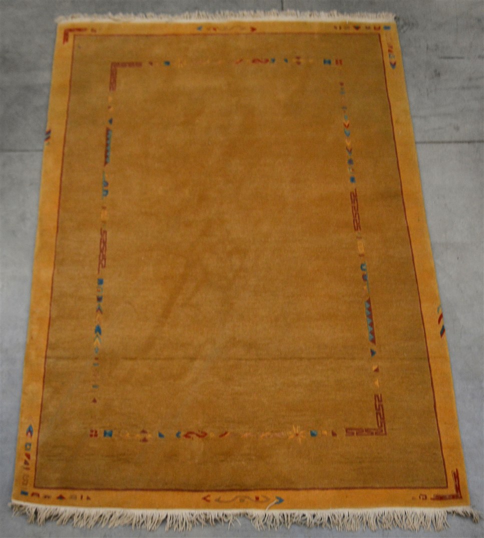 Tappeto di moderna manifattura, Nepal, secolo XX. Campo a tina unita color camoscio con piccoli disegni geometrici e bordura in tonalità più chiara (cm 237x167) (difetti)