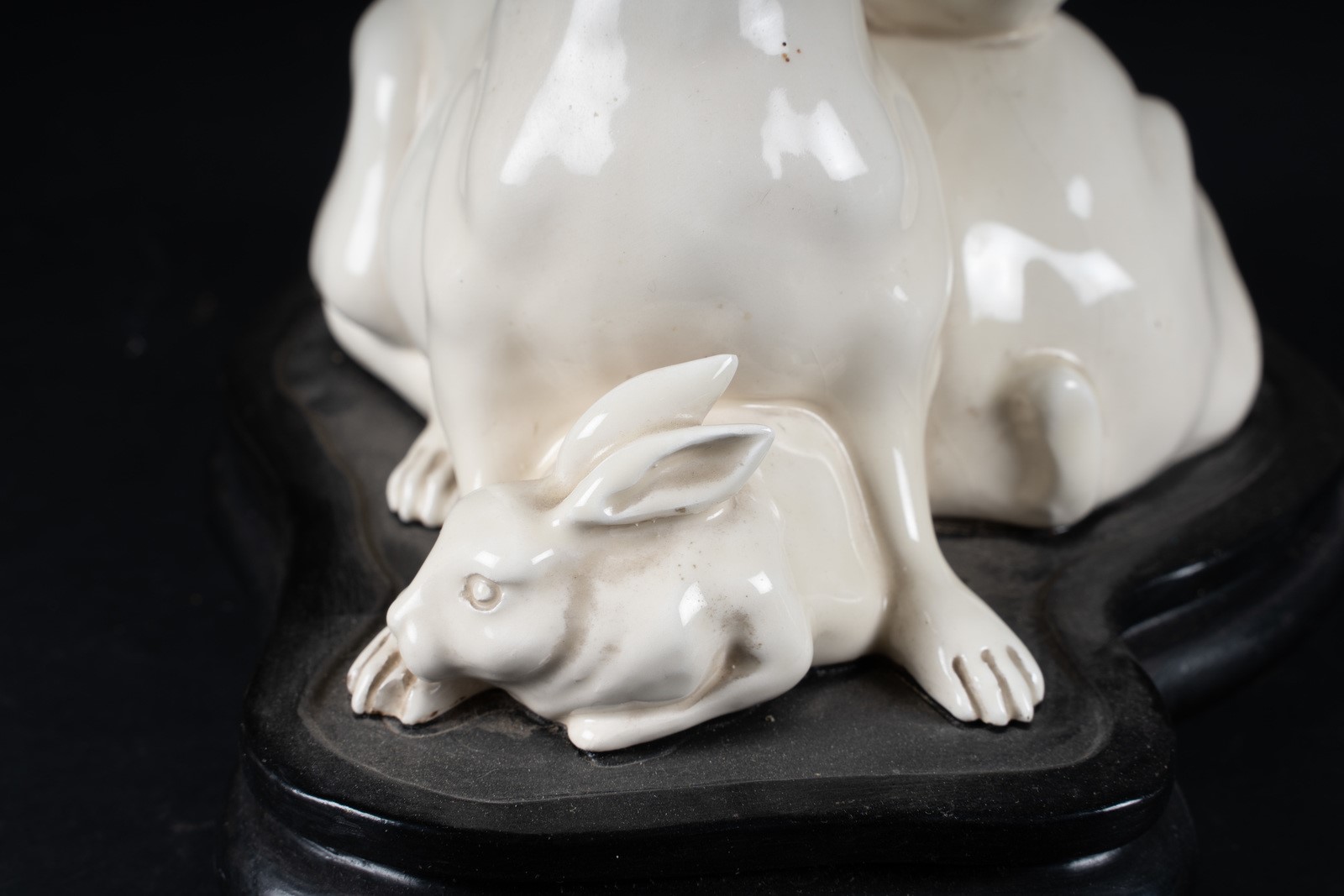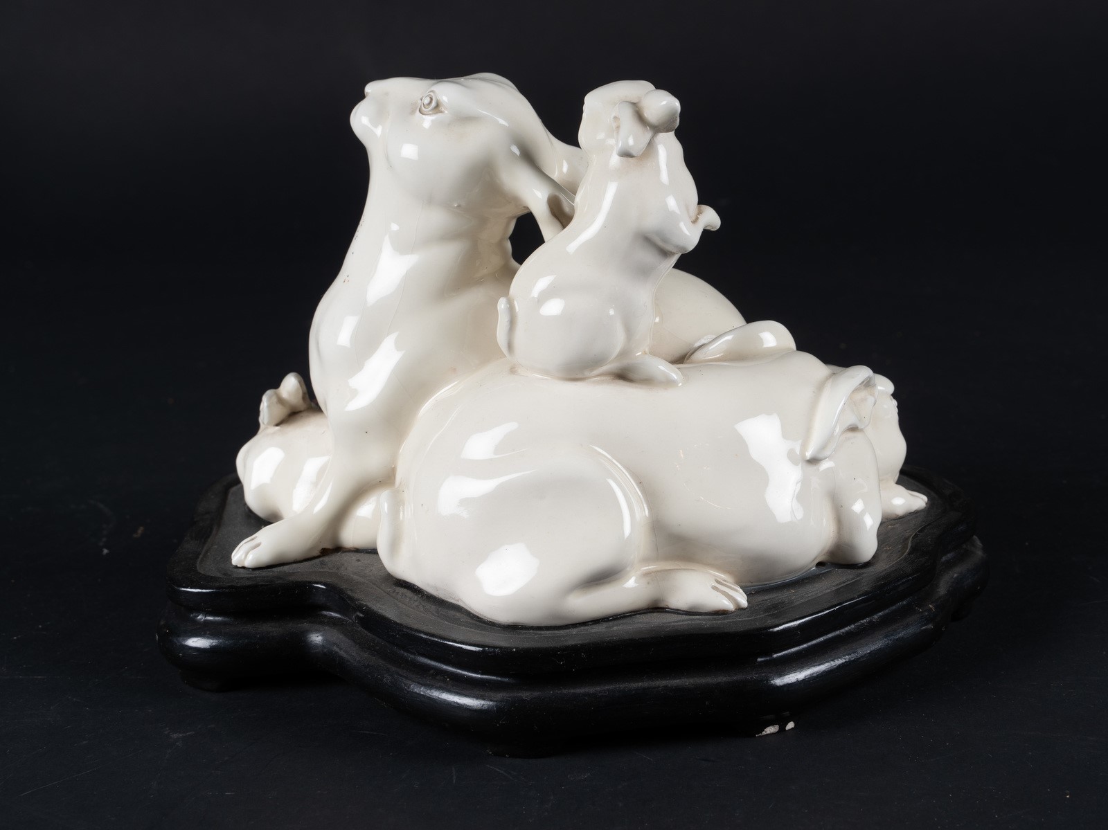 Chinese Art A dehua porcelain group depicting four hares China, Qing dynasty, 19th century . . Cm 22,00 x 13,00. wooden base.