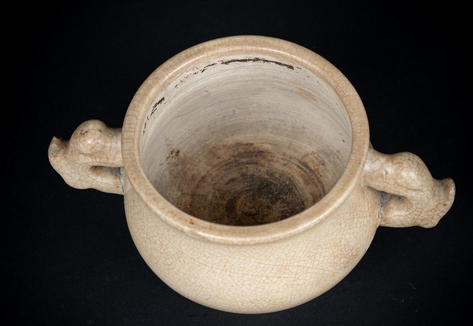 Chinese Art A craquelé porcelain footed cup with pig dragon handlesChina, Qing dynasty, 18th century . . Cm 13,50 x 7,50. Chips.