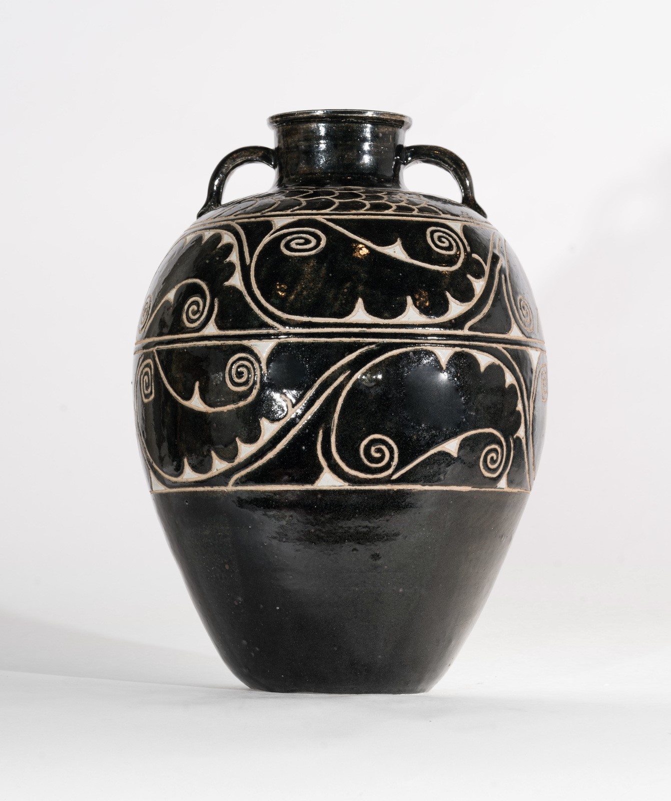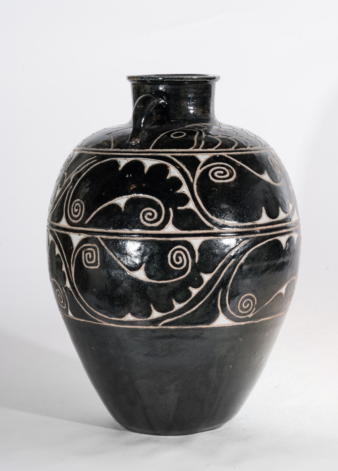 Chinese Art A Cizhou black glazed pottery vase with scratched decoration depicting fishes and waves.China, Ming dinasty 15th century (?). . . Cm 28,00 x 50,00.