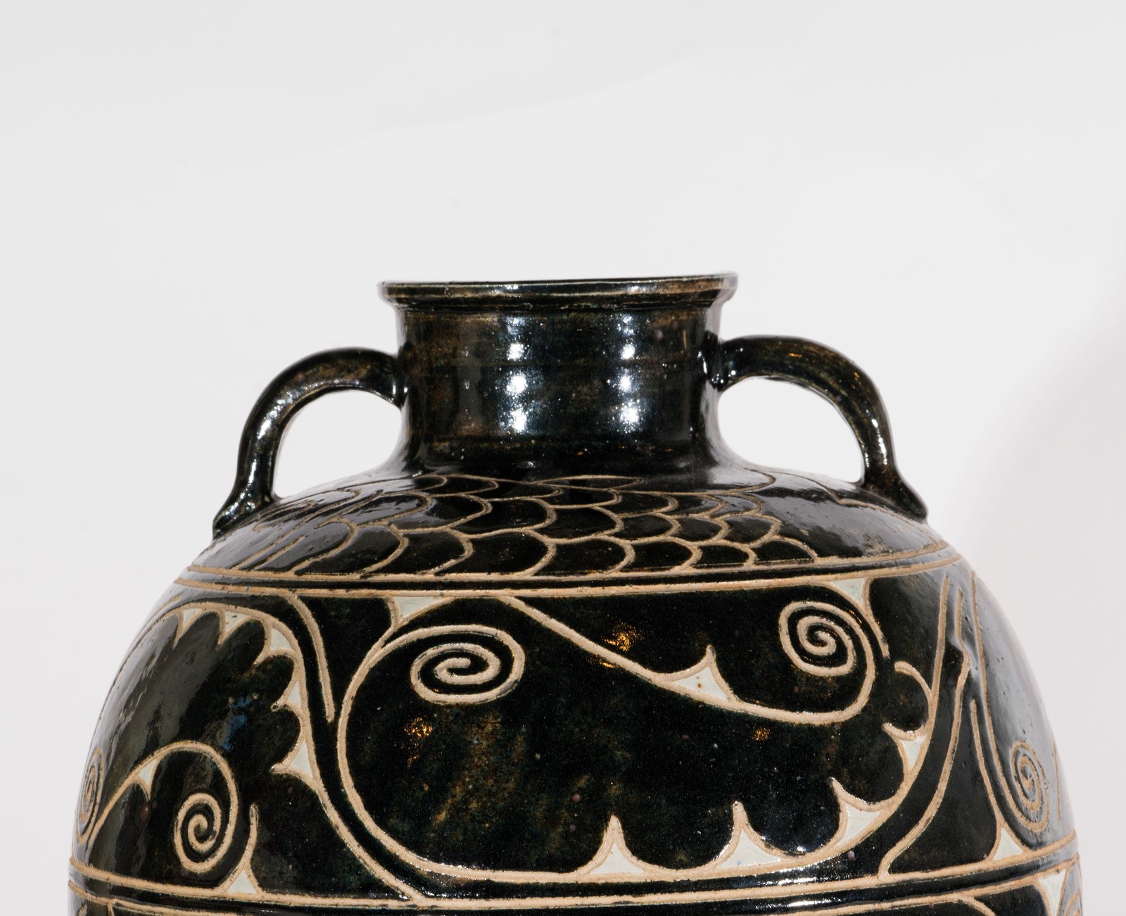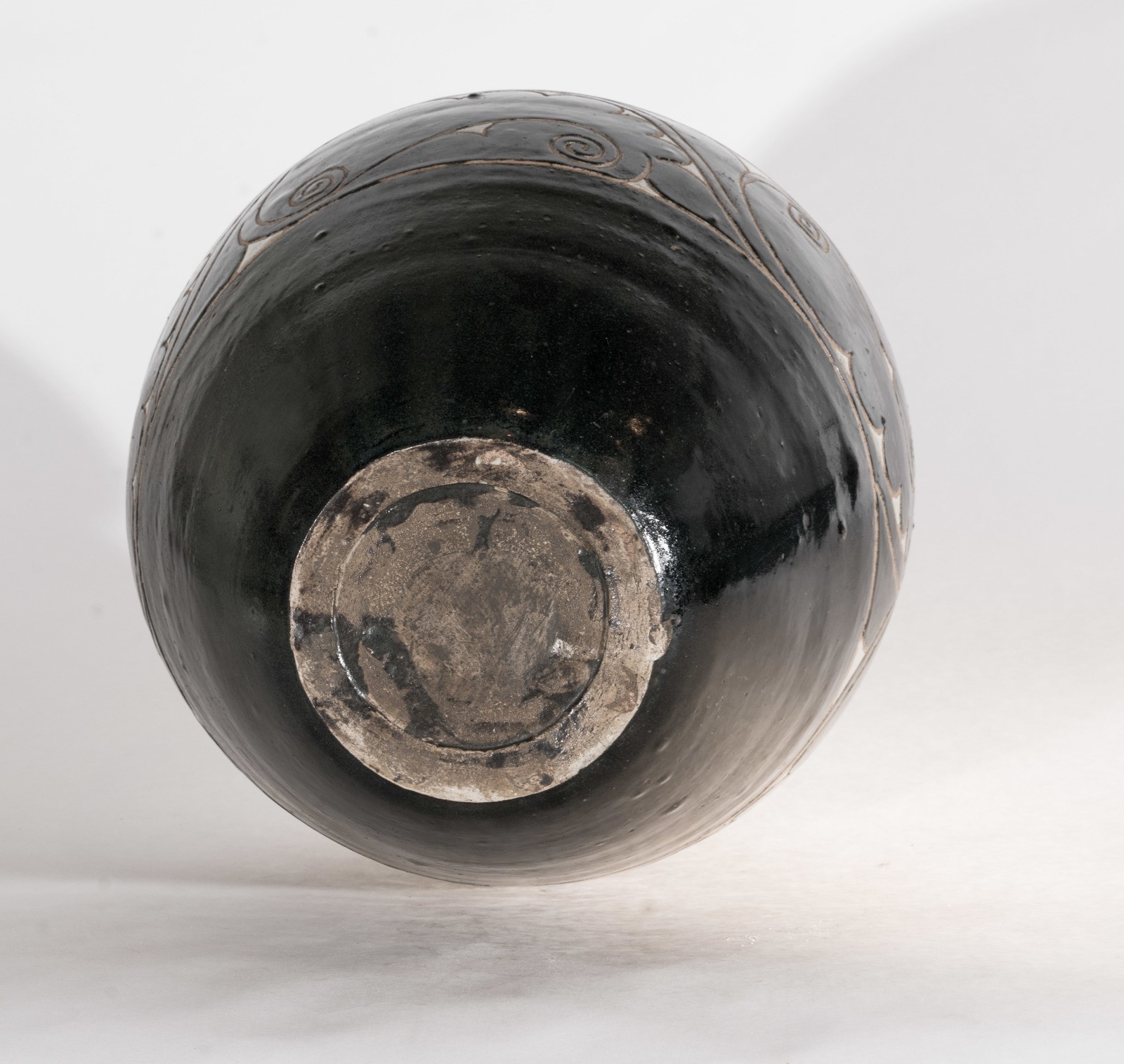 Arte Cinese A Cizhou black glazed pottery vase with scratched decoration depicting fishes and waves.China, Ming dinasty 15th century (?). .