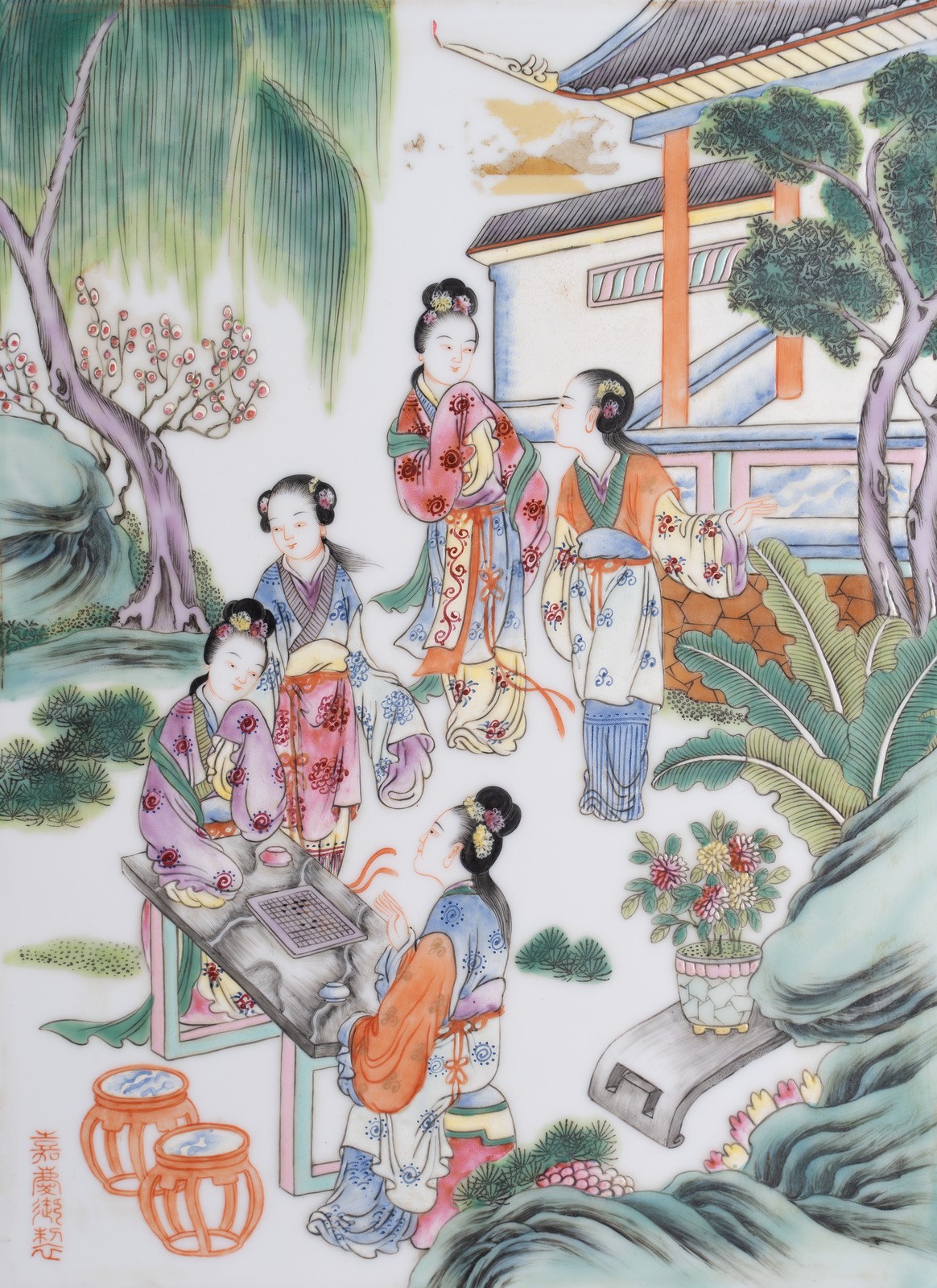 Arte Cinese A famille rose porcelain plaque painted with ladies at leisure in garden China, Qing dynasty, late 19th-ealry 20th century .